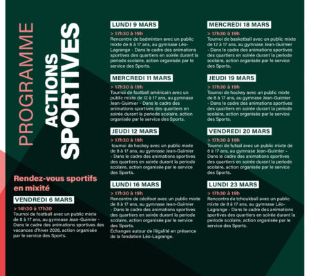 Dans le cadre du Mois de l’égalité 2026, la Ville de Stains propose également un programme d’actions sportives tout au long du mois de mars.