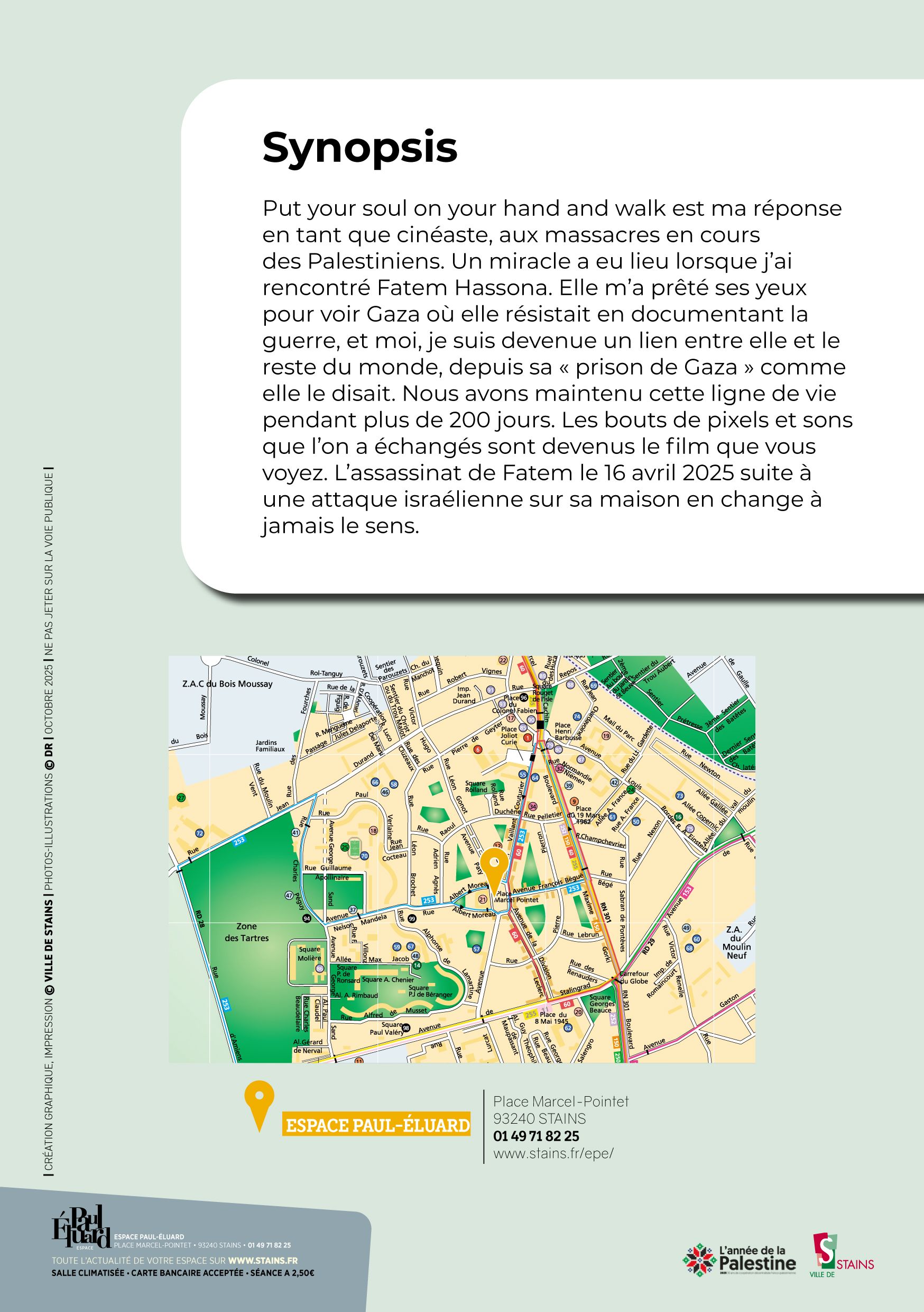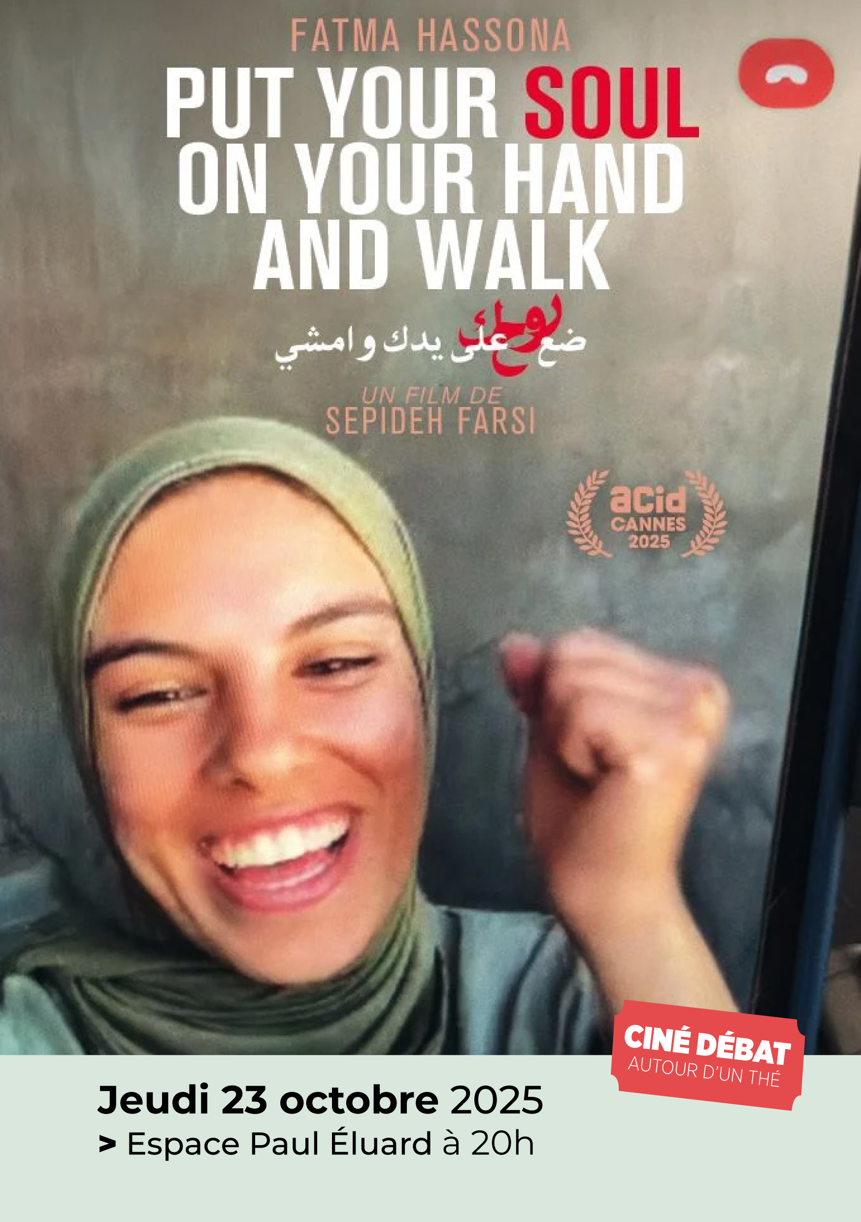Dans le cadre de l’Année de la Palestine, l’Espace Paul Éluard vous invite à la projection du film Put your soul on your hand and walk de Sepideh Farsi, suivie d’un ciné-débat autour d’un thé.