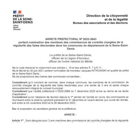 Portant nomination des membres des commissions de contrôle chargées de la régularité des listes électorales dans les communes du département de la Seine-Saint-Denis