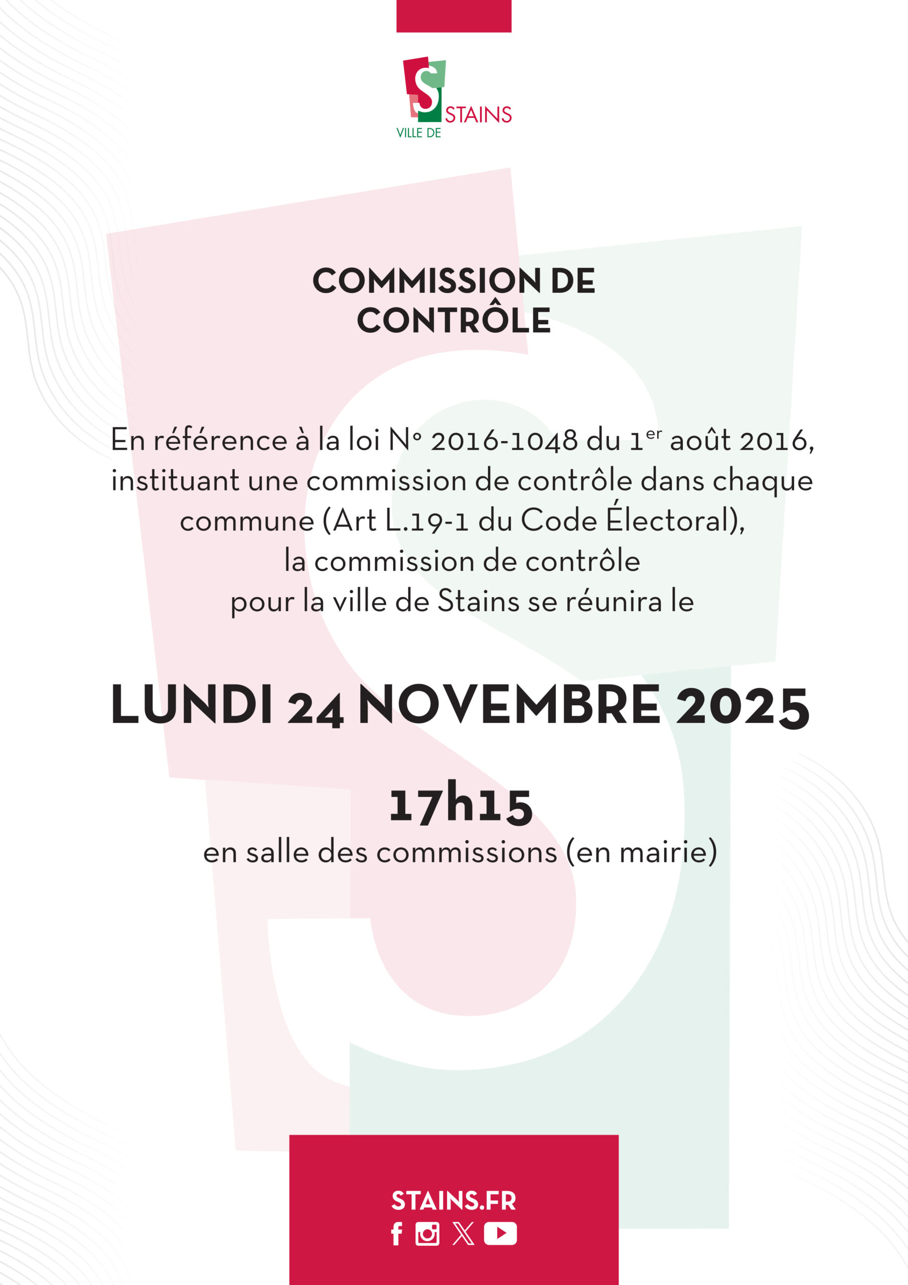 En référence à la loi N° 2016-1048 du 1er août 2016, instituant une commission de contrôle dans chaque commune (Art L.19-1 du Code Électoral), la commission de contrôle pour la ville de Stains se réunira le lundi 24 novembre 2025.