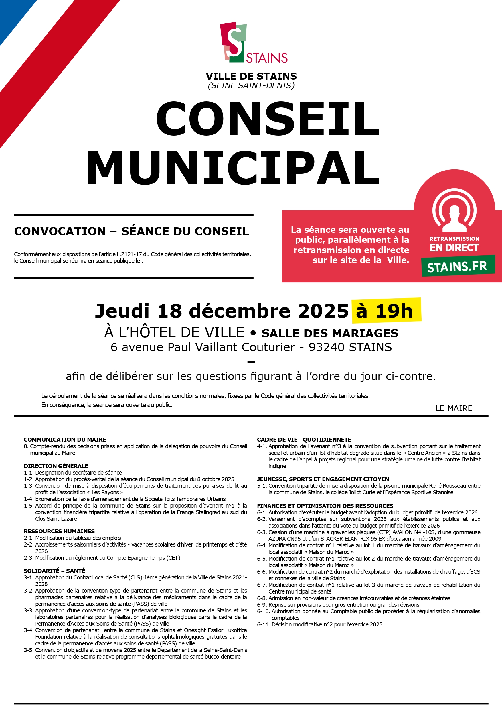 Pour celles et ceux qui ne pourront pas se déplacer, la séance sera également retransmise en direct sur la page dédiée du site de la Ville : https://stains.fr/vie-municipale/mairie/les-seances-des-conseils-municipaux/
