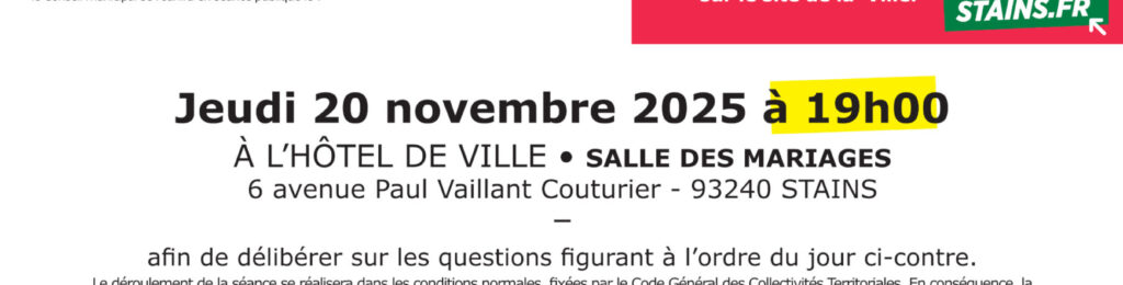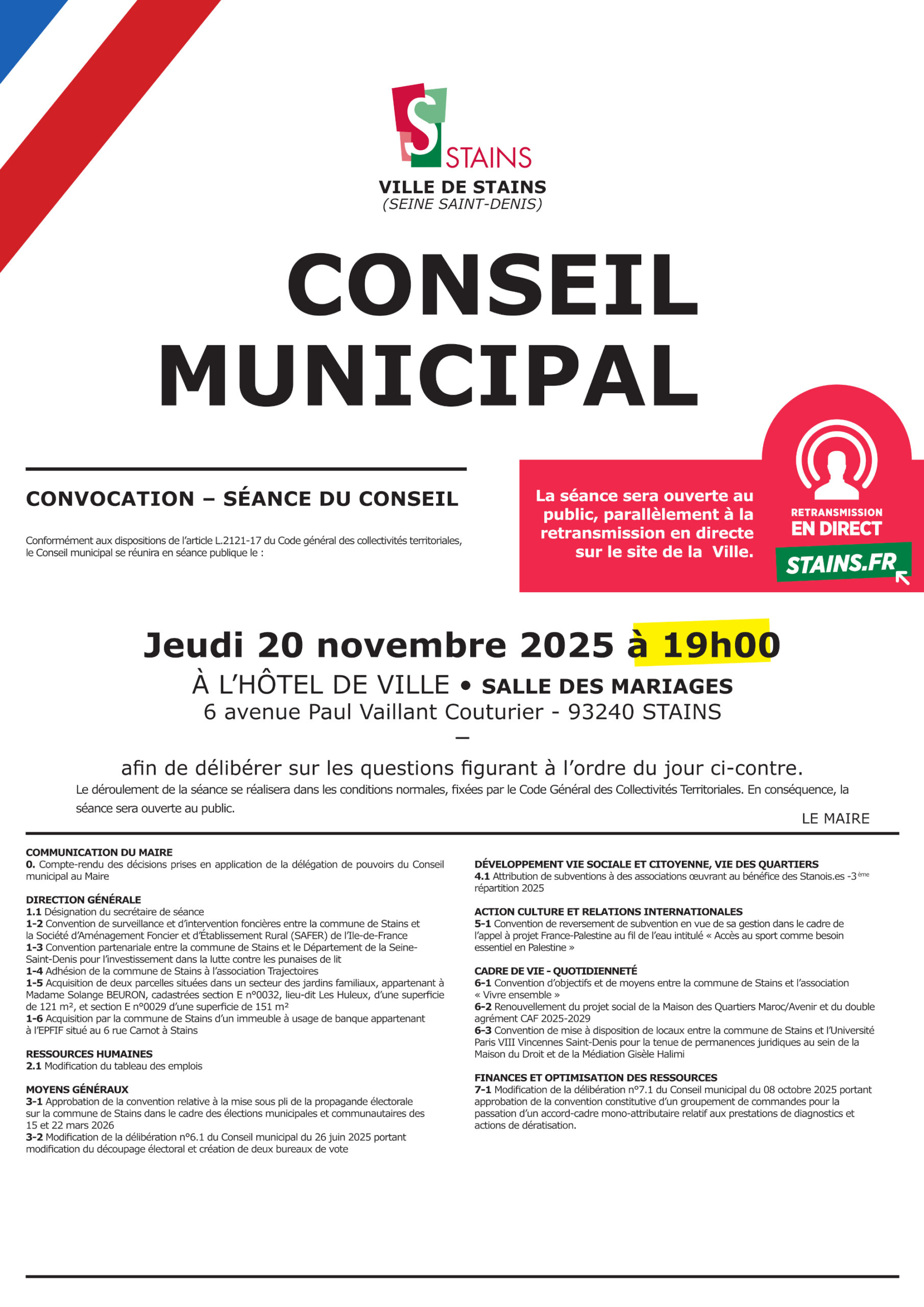 Conseil municipal du jeudi 20 novembre 2025 – Diffusion en direct à partir de 19h