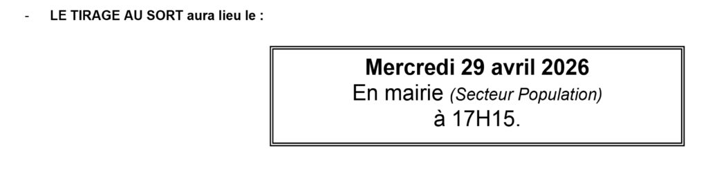 Le tirage au sort se déroulera le mercredi 29 avril 2026 à 17h15, en mairie (secteur Population).