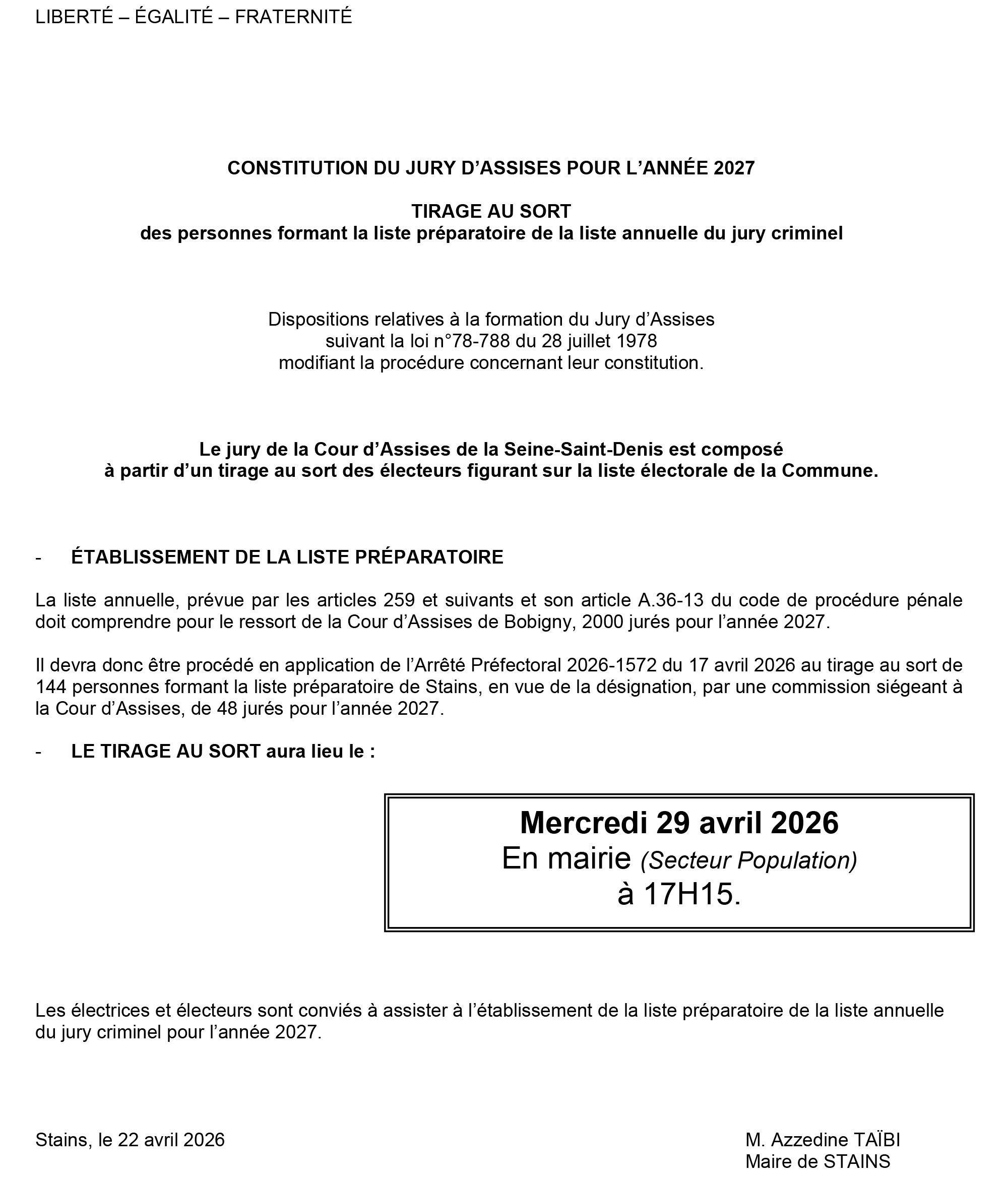 À Stains, 144 personnes seront tirées au sort afin de constituer cette liste préparatoire, en vue de la désignation finale de 48 jurés pour l’année 2027.