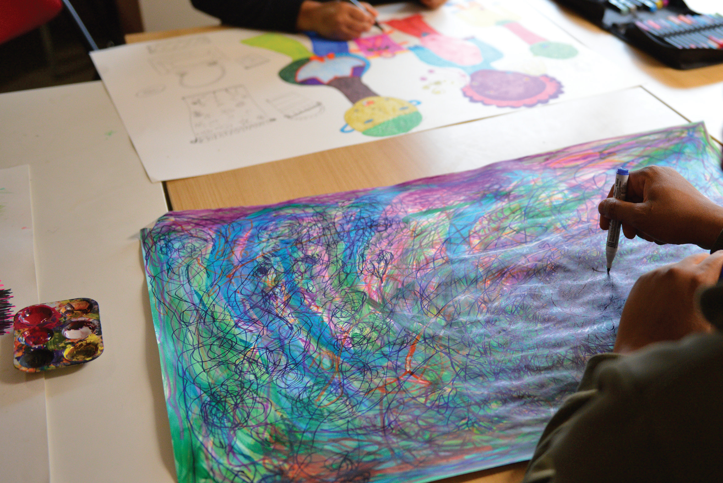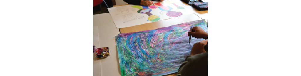 Dans une grande salle du deuxième étage du foyer des Trois-Rivières, Merline et Yacoub ont les yeux rivés sur leurs oeuvres. « Nous devons finir rapidement, car l’exposition approche », confie Merline. « J’aime mettre beaucoup de couleurs, là, ce sont des rideaux et là un sceau », prend-t-elle le temps de partager. Yacoub, encouragé par son éducatrice Kadi, est sur une production aux couleurs plus sombres sur laquelle il ajoute des cercles au feutre bleu.
