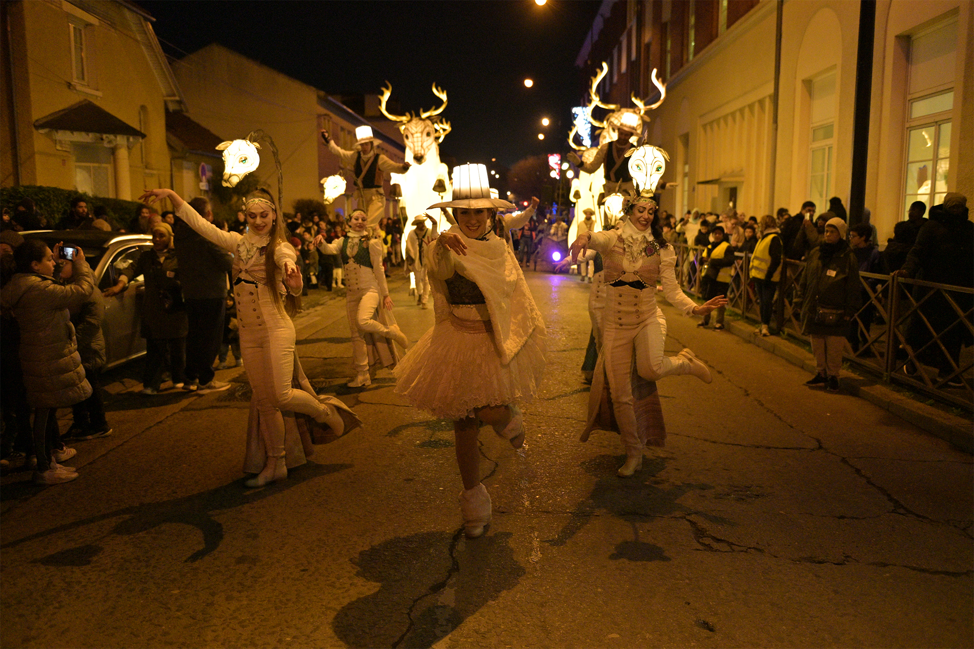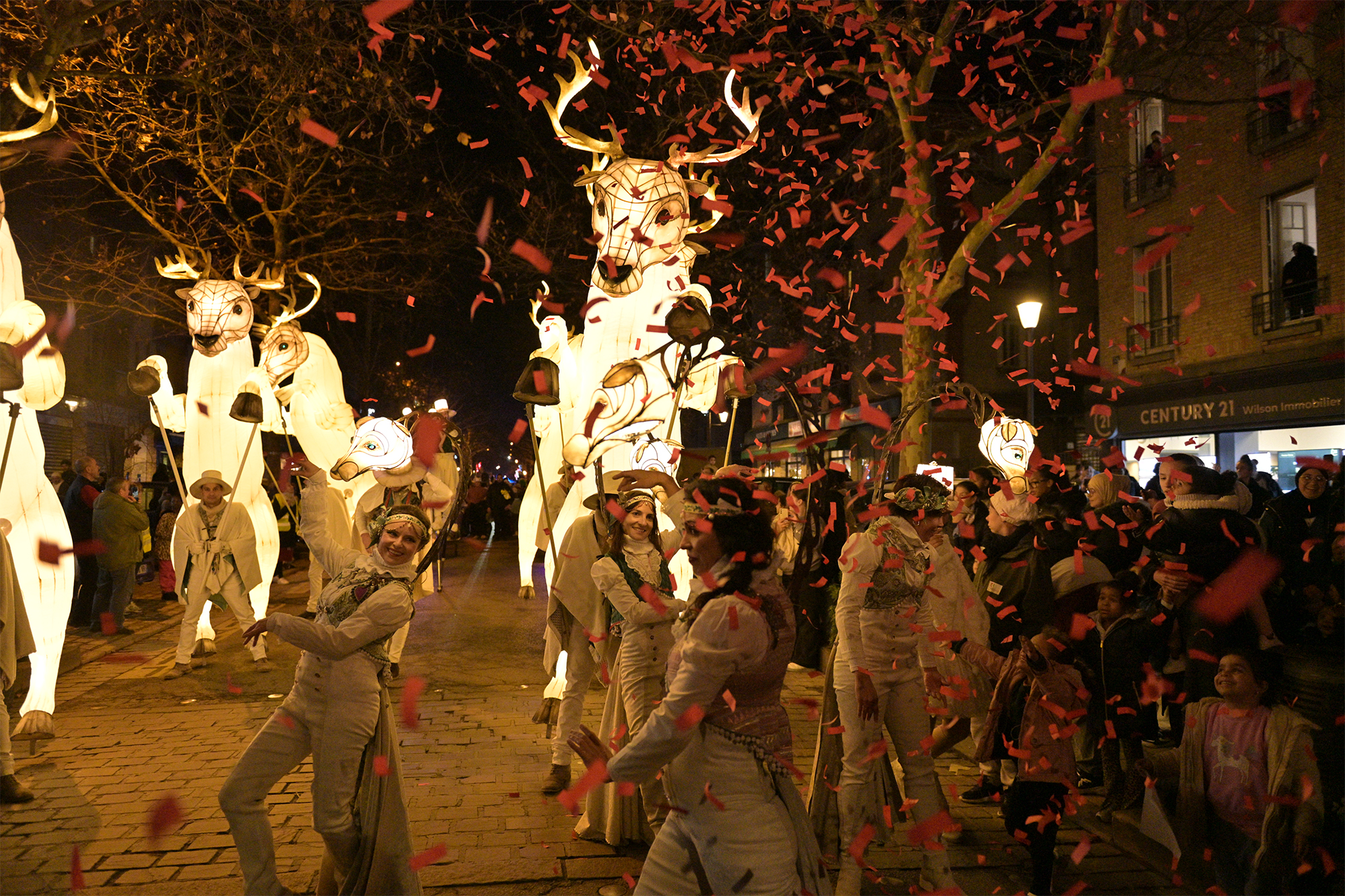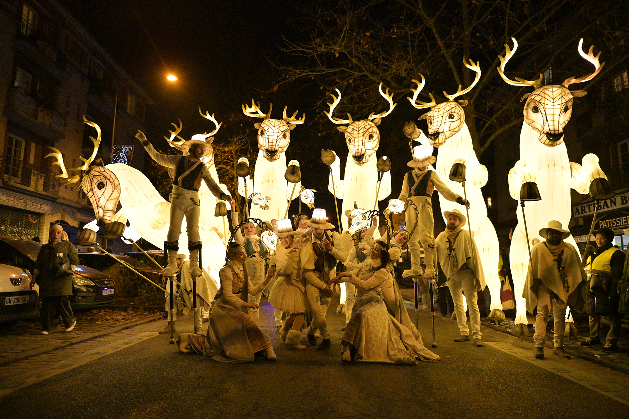 Dès 17h30, un spectacle artistique mêlant danse et structures géantes lumineuses a animé le parvis de la mairie, donnant le coup d’envoi d’une déambulation festive jusqu’à la place Marcel-Pointet.