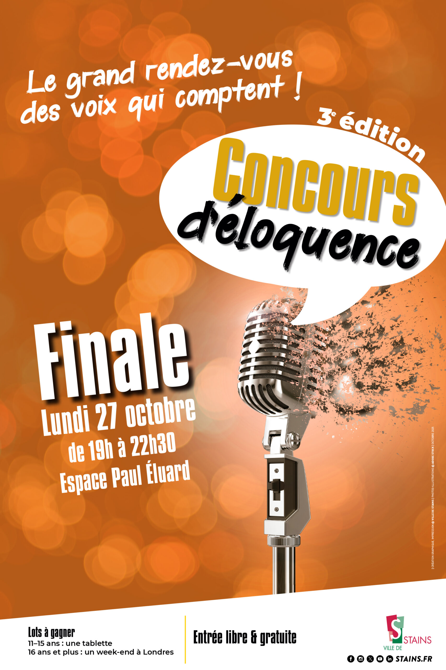 Le lundi 27 octobre, de 19h à 22h30, l’Espace Paul Éluard à Stains accueillera la grande finale de la 3ᵉ édition du concours d’éloquence.