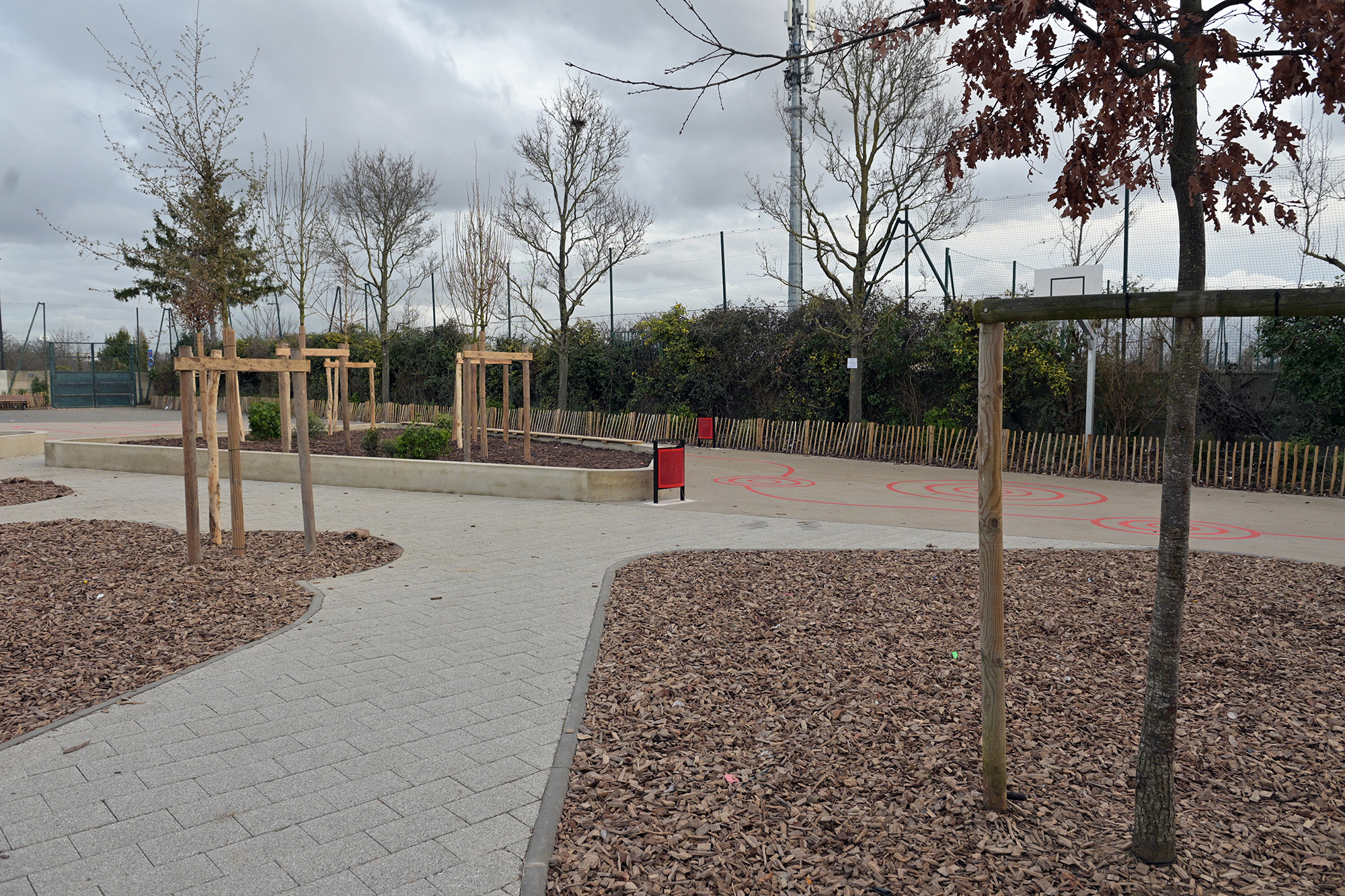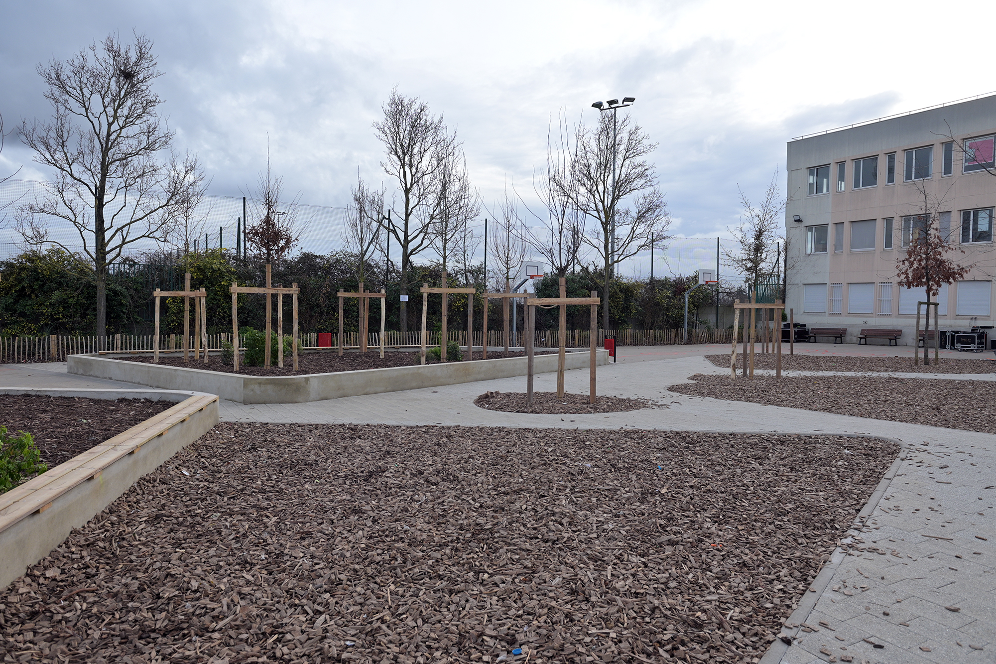 Pensée pour améliorer le bien-être des élèves et lutter contre les îlots de chaleur, cette cour repensée a notamment permis le retrait de 60 % de l’enrobé existant, au profit d’espaces végétalisés, plus perméables et plus apaisants.