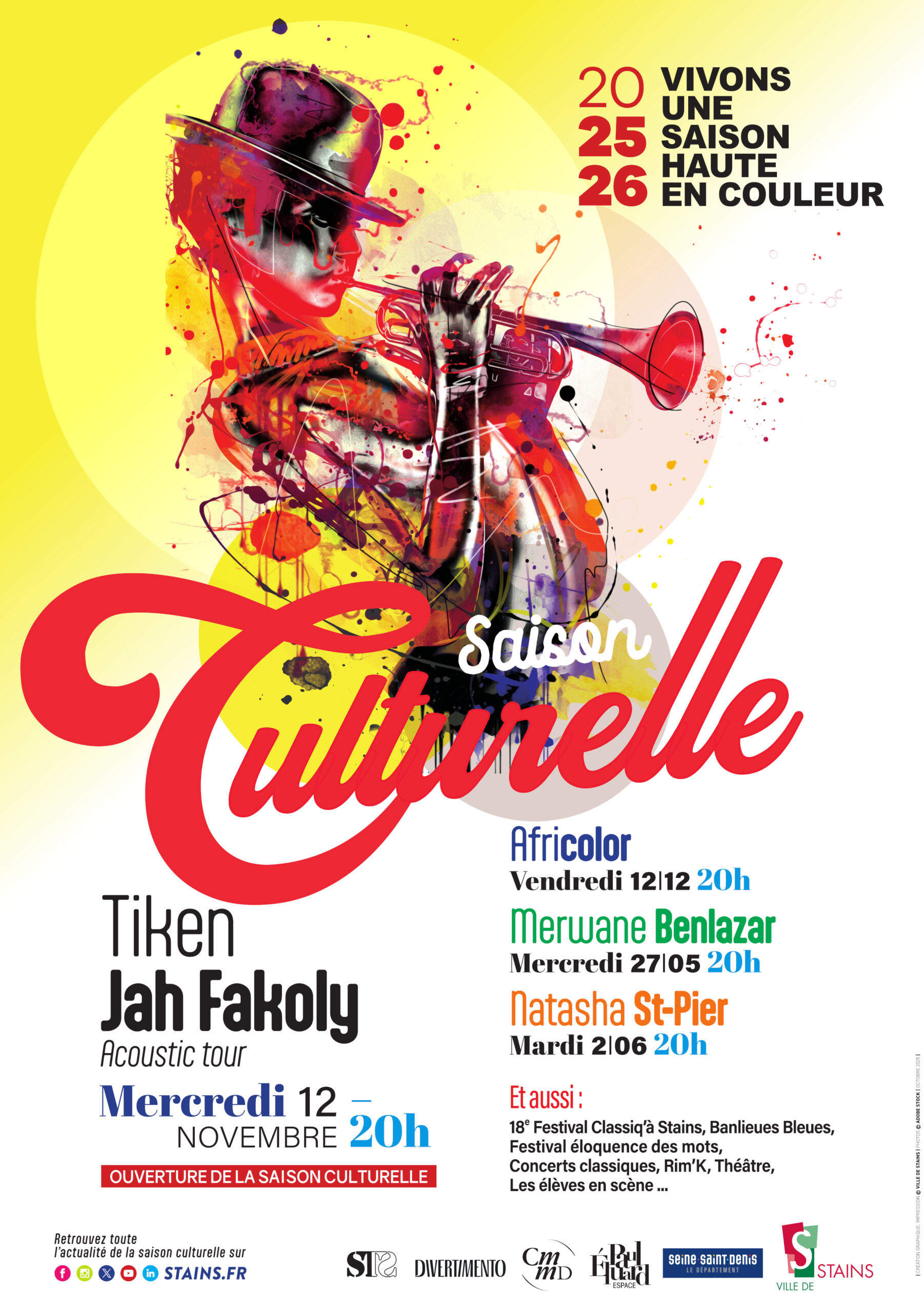 La saison débutera le mercredi 12 novembre à 20h avec Tiken Jah Fakoly, qui vient à Stains pour un voyage musical militant et authentique.