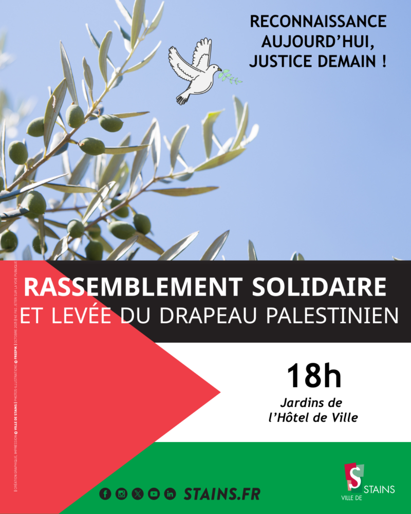 À Stains, ville engagée depuis de nombreuses années pour la justice, la paix et la solidarité entre les peuples, nous vous invitons à un rassemblement solidaire ce lundi 22 septembre à 18h dans les jardins de l’Hôtel de Ville.