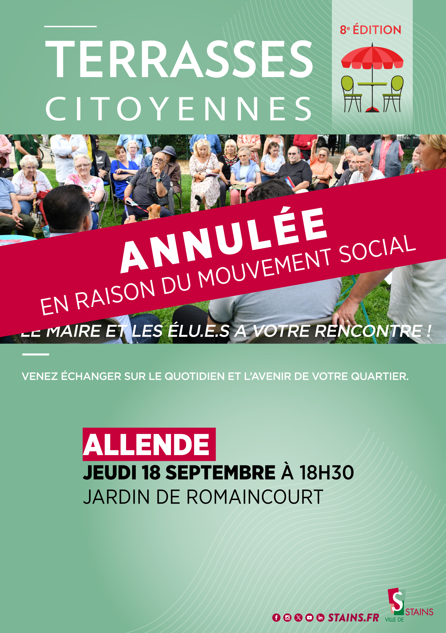 La terrasse citoyenne prévue ce jeudi 18 septembre à 18h30 dans le quartier Allende (Jardin de Romaincourt) est annulée en raison du mouvement social national prévu ce jour-là.