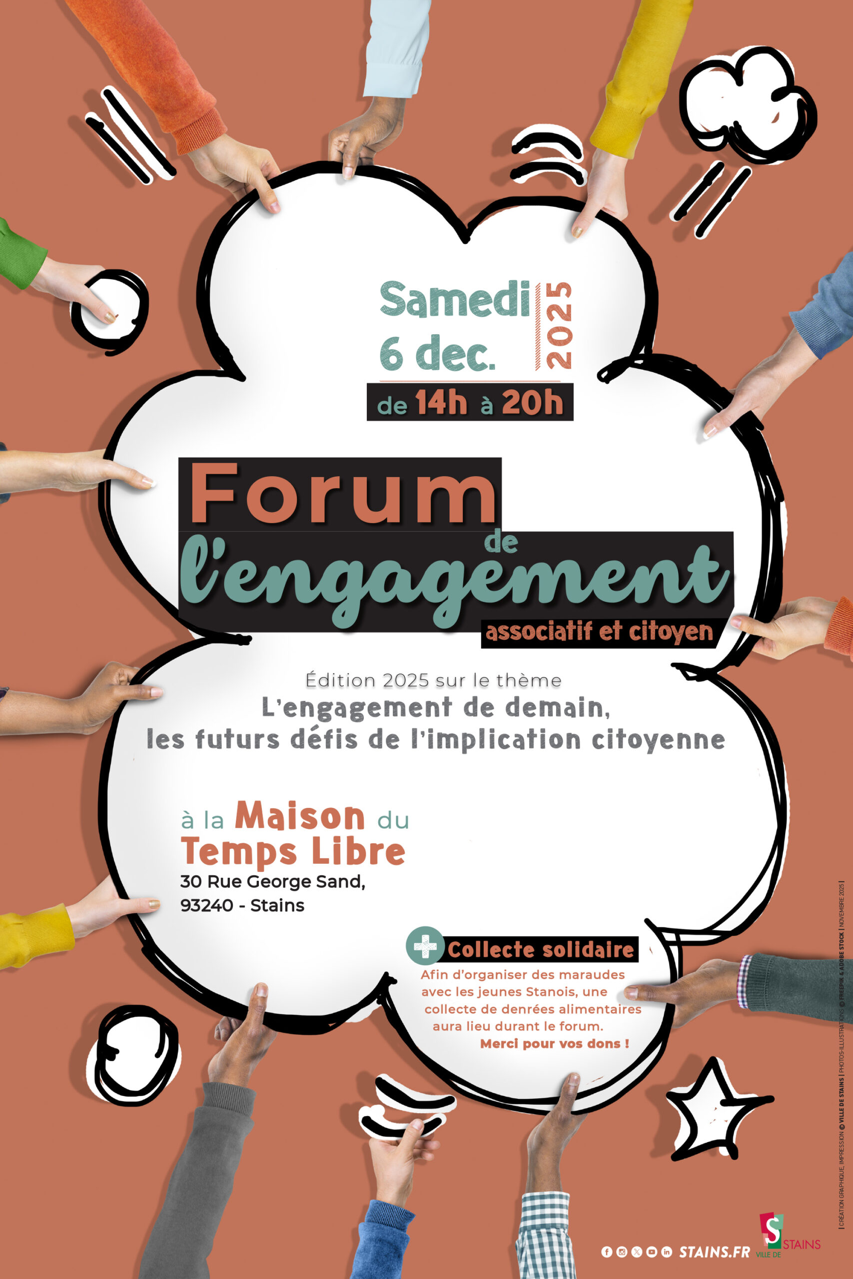 Après l’intervention du maire et de Zahïa Nedjar, une vidéo reviendra sur la maraude des jeunes organisée en 2024 et une autre présentera les différentes instances citoyennes de Stains. Viendra ensuite la distribution des passeports bénévoles avant le temps consacré aux différentes instances. L’après-midi se clôturera sur une note festive avec le cocktail de l’engagement de 18h15 à 19h. Engagez-vous !