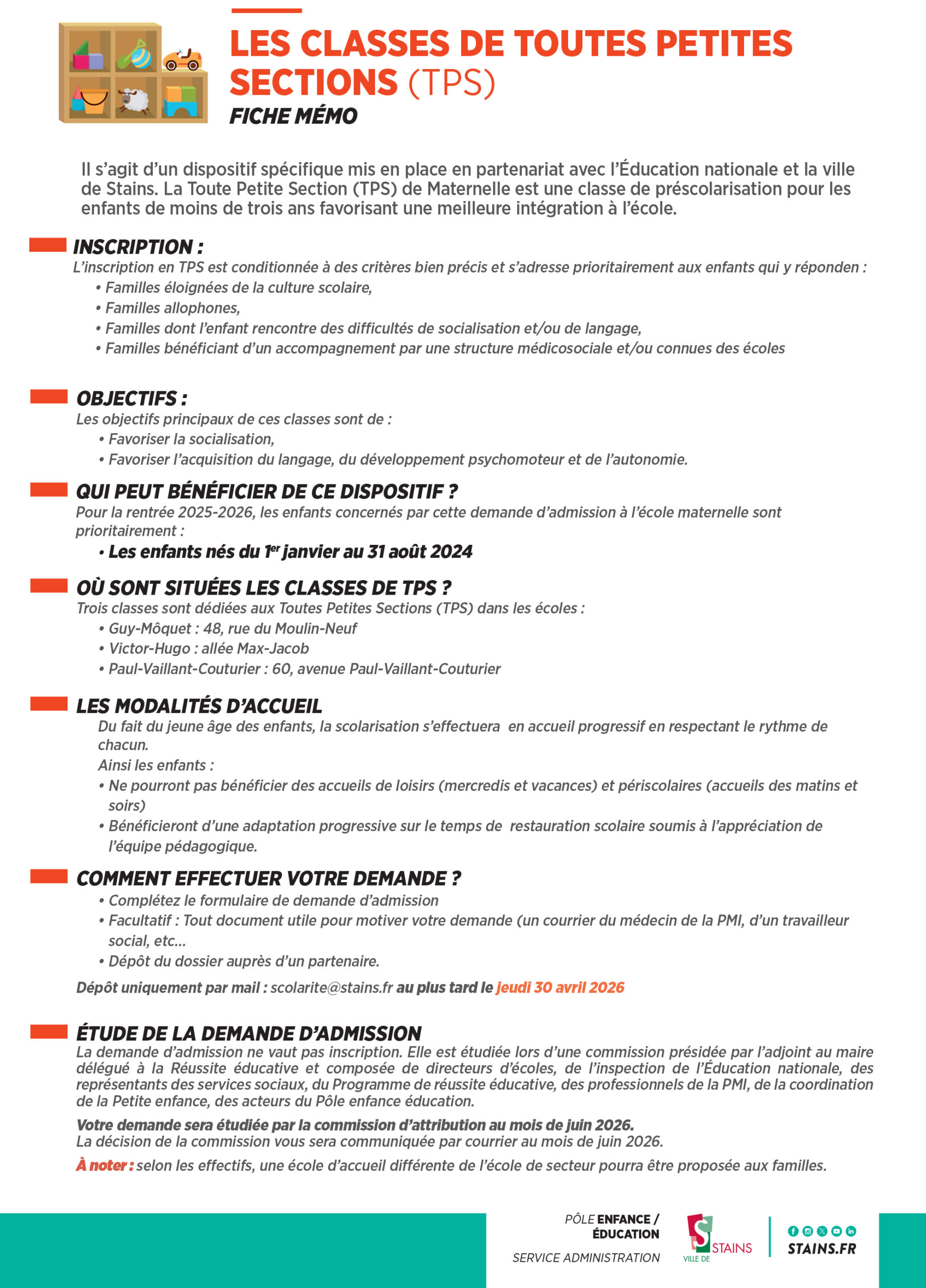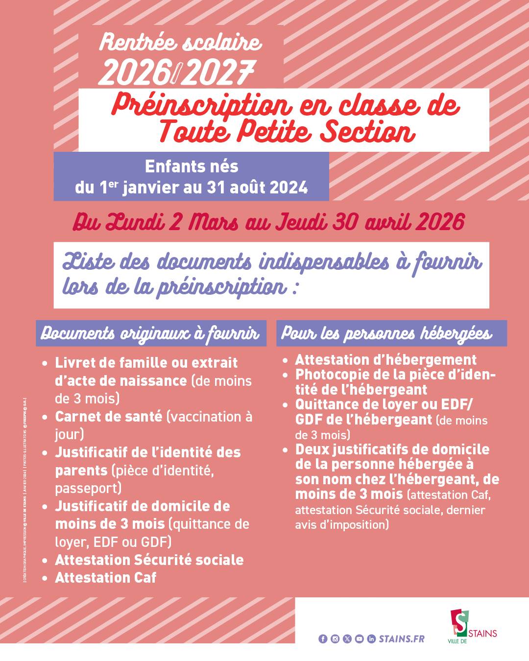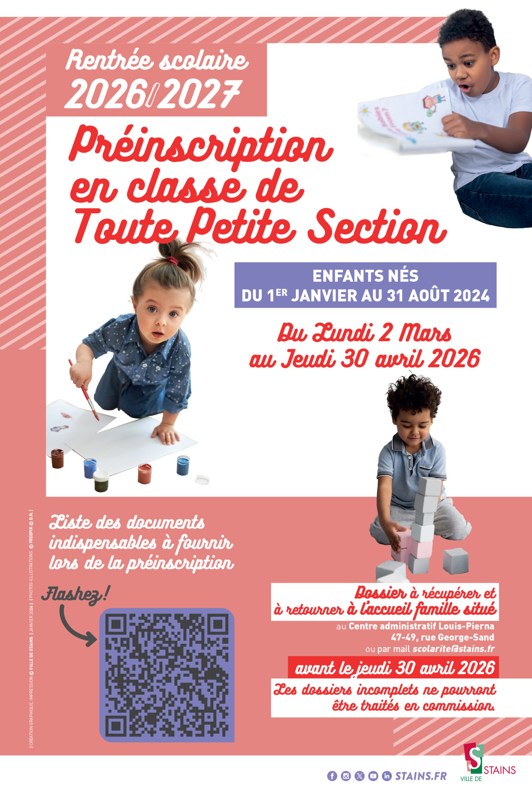 La Ville de Stains ouvre les préinscriptions en classe de Toute Petite Section (TPS) pour la rentrée 2026/2027.