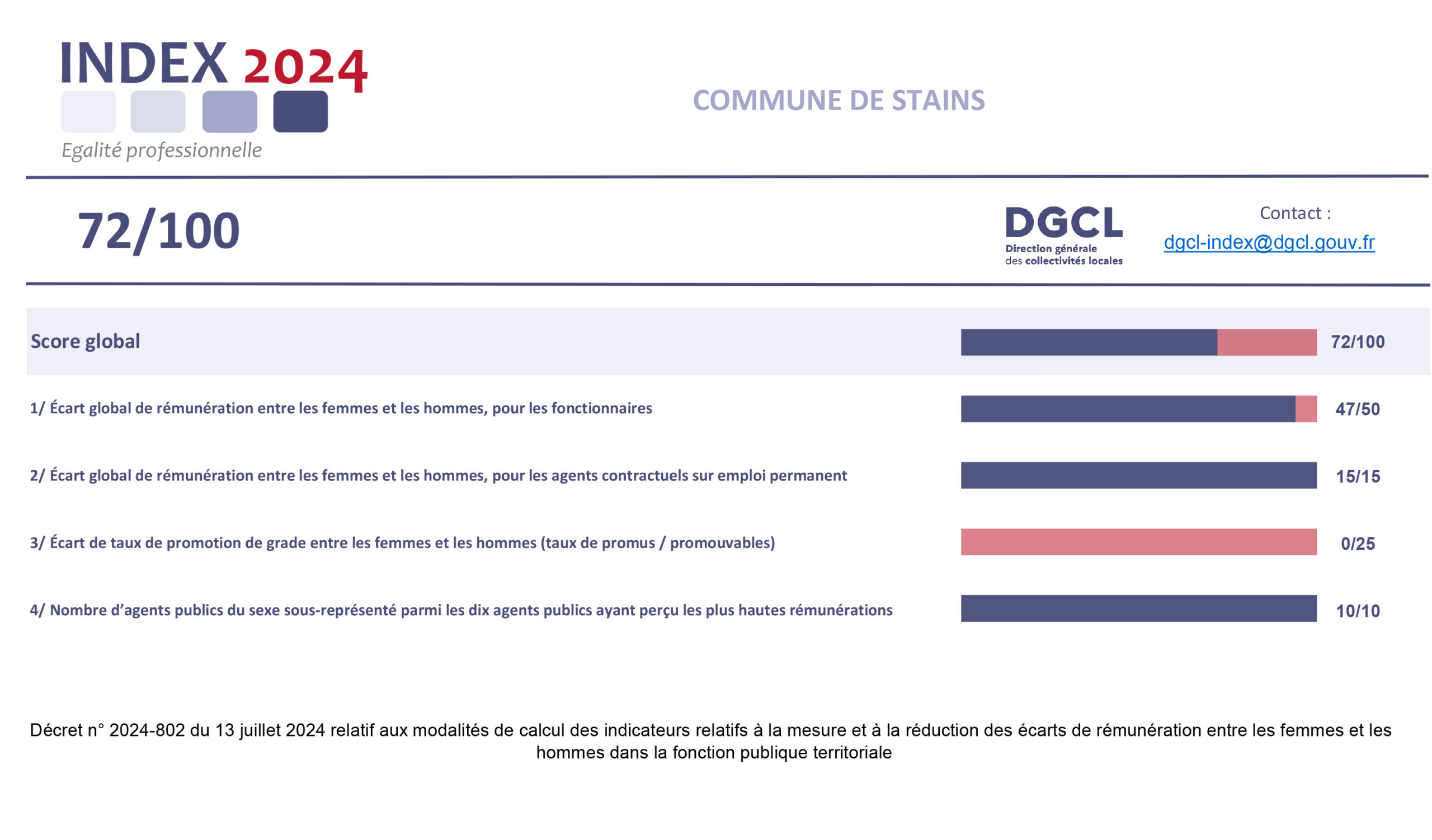 L’index 2024 pour la Ville de Stains atteint le score de 72 points et donc, pour cette 2ème année consécutive, la cible de 75 points fixée par le cadre juridique n’est pas atteinte.