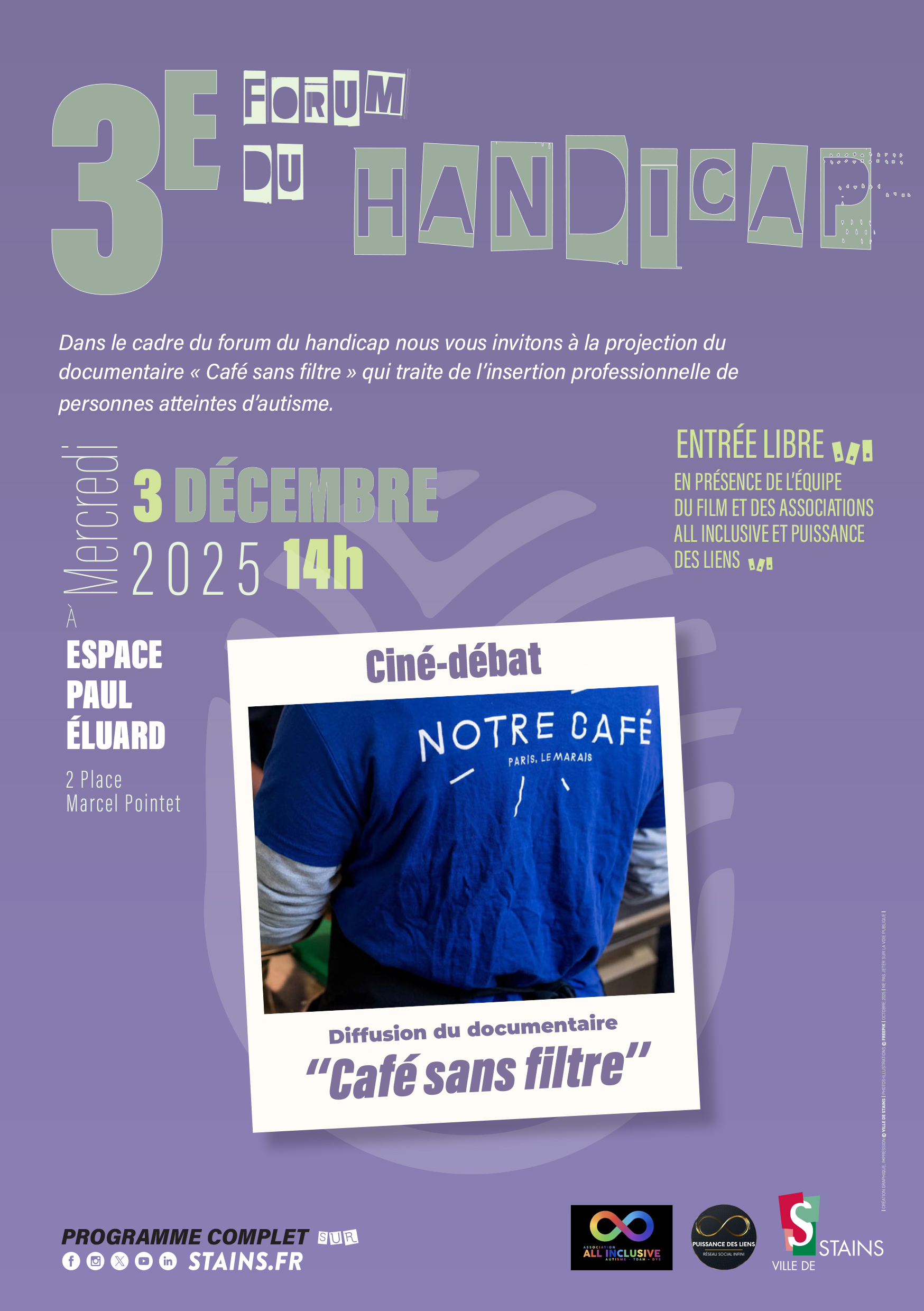 Mercredi 3 décembre à 14h, la projection du documentaire Café sans filtre qui traite de l’insertion professionnelle de personnes atteintes d’autisme, à l’EPE.