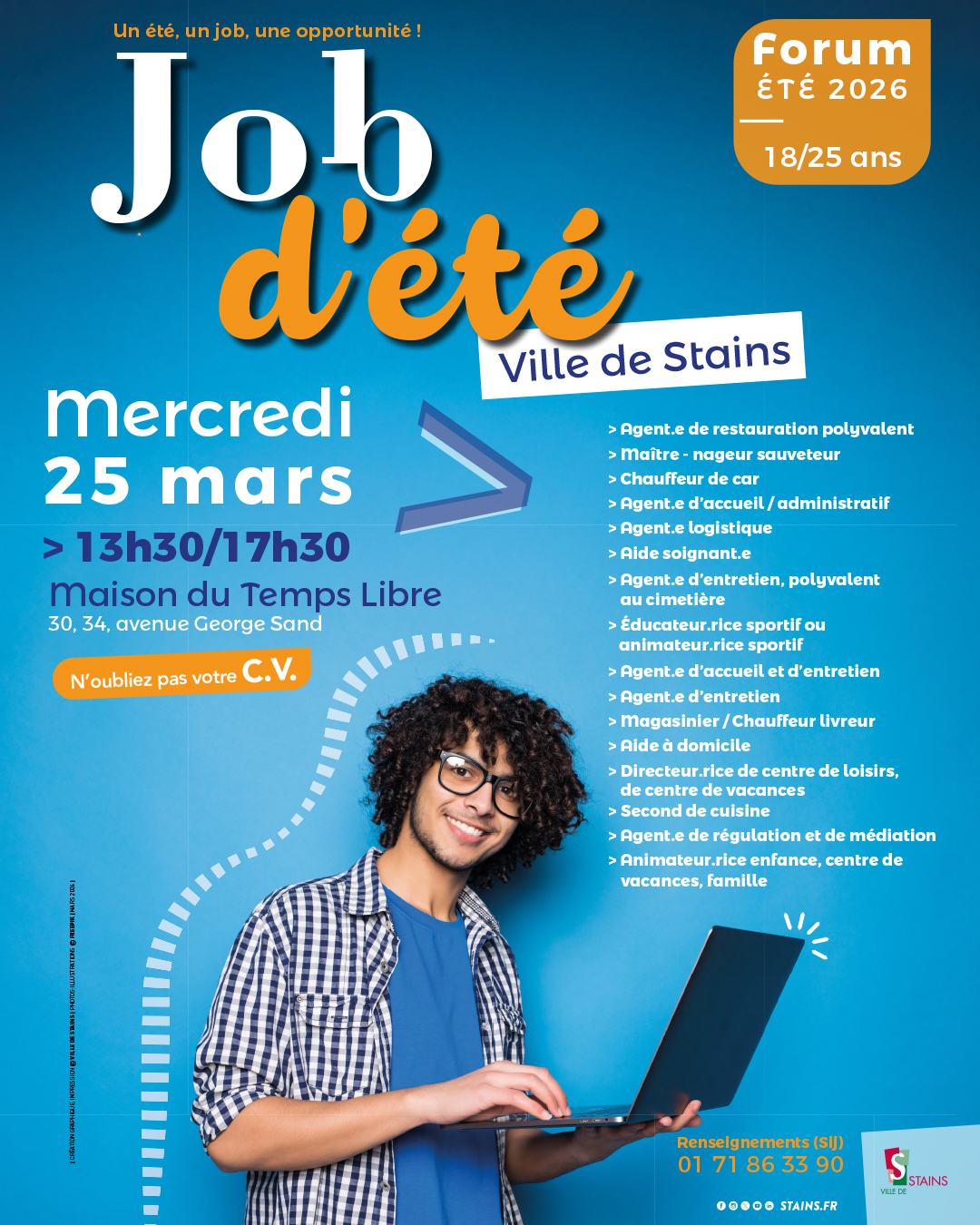 Les jeunes Stanois de 18 à 25 sont invités à participer à cette nouvelle édition du forum Job d’été qui se tiendra mercredi 25 mars, de 13 h 30 à 17 h 30, à la Maison du temps libre Olivier-Abdéride pour découvrir les postes à pourvoir et postuler.