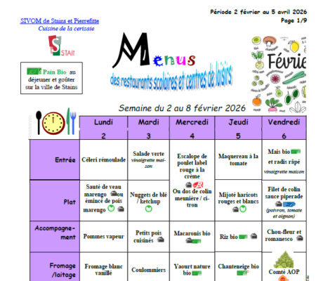 Les menus sont susceptibles d’être modifiés en cas de causes indépendantes de notre volonté (contraintes d’approvisionnement, panne de matériel, grève…) afin d’assurer la continuité de la restauration scolaire et limiter le gaspillage alimentaire.