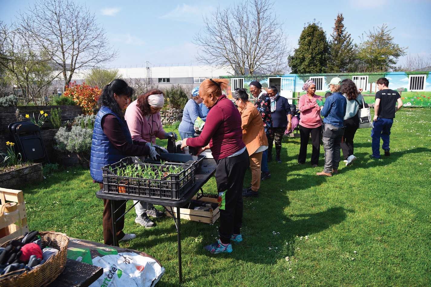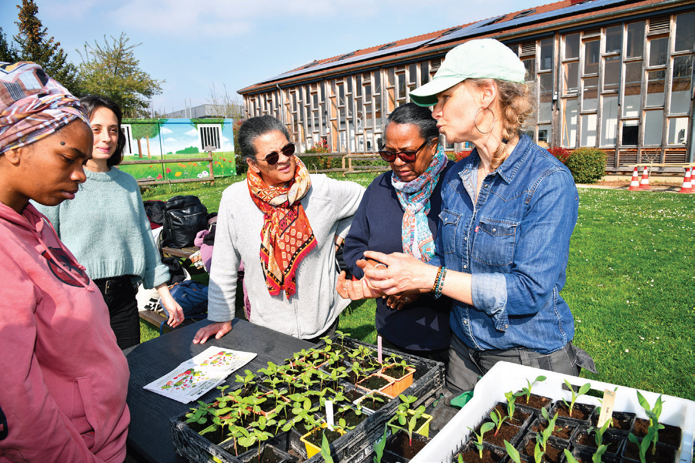 Deux amies qui ont fait le déplacement n’ont pas de balcon ou jardin, mais sont ravies de pouvoir profiter d’un moment agréable à toucher la terre. Vient ensuite un temps dans le jardin participatif. Les apprentis maraîchers désherbent et mettent en terre des plantes aromatiques, fleurs comestibles et petits fruits.
