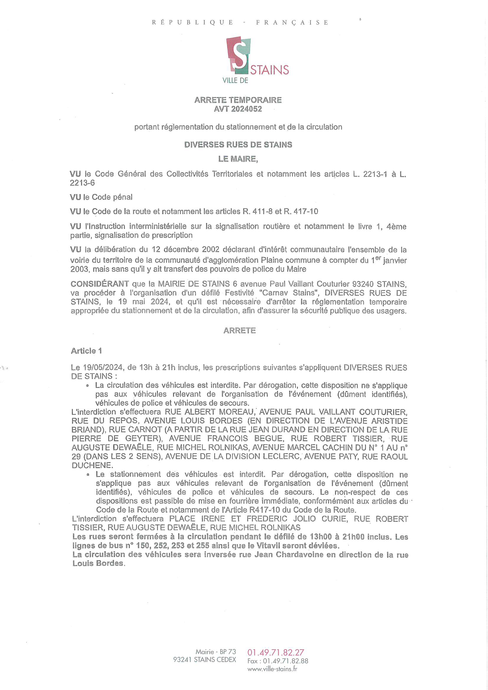 La circulation sera interdite dans les rues et avenues suivantes : Place Irene et Frederic Jolio Curie, Rue Albert Moreau, Avenue Paul Vaillant Couturier, Rue Du Repos, Avenue Louis Bordes (En direction de l’avenue Aristide Briand), Rue Carnot (A partir de la rue Jean Durand en direction de la Rue Pierre De Geyter), Avenue Francois Begue, Rue Robert Tissier, Rue Auguste Dewaële, Rue Michel Rolnikas, Avenue Marcel Cachin Du N° 1 Au N° 29 (Dans les 2 sens), Avenue De La Division Leclerc, Avenue Paty, Rue Raoul Duchene.