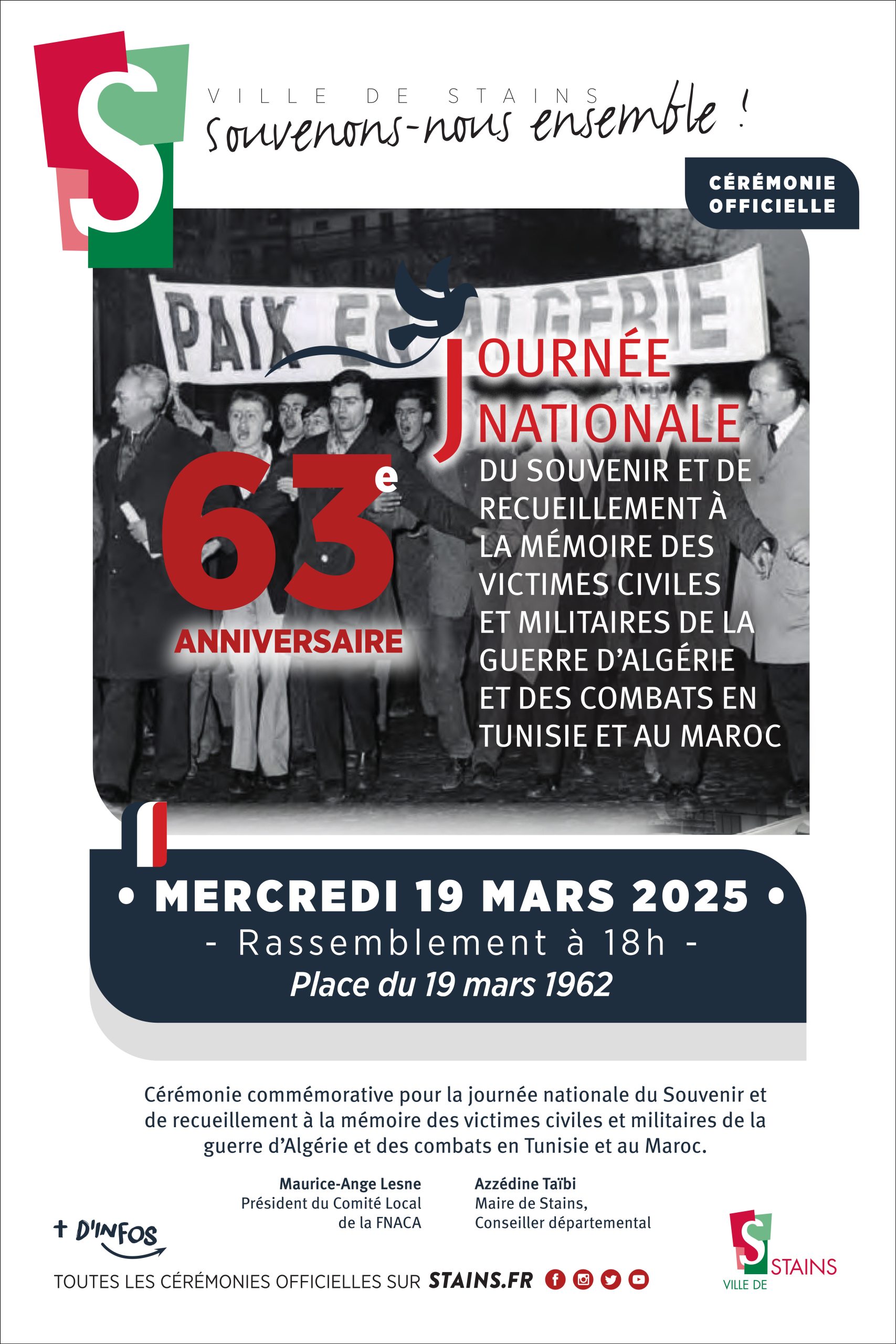 Rassemblement pour la cérémonie commémorative le mercredi 19 mars à 18h sur la Place du 19 mars 1962, en face du Centre Municipal de Santé Colette Coulon.