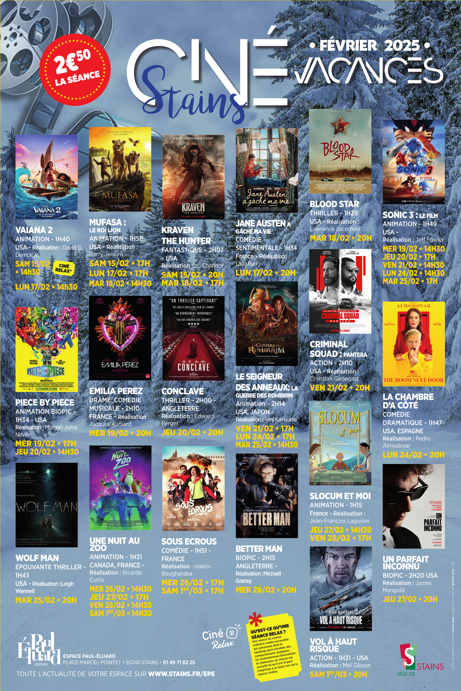 Retrouvez le programme de Ciné-Vacances avec un tarif unique de 2€50 par séance la séance du 15 février au 1er mars.