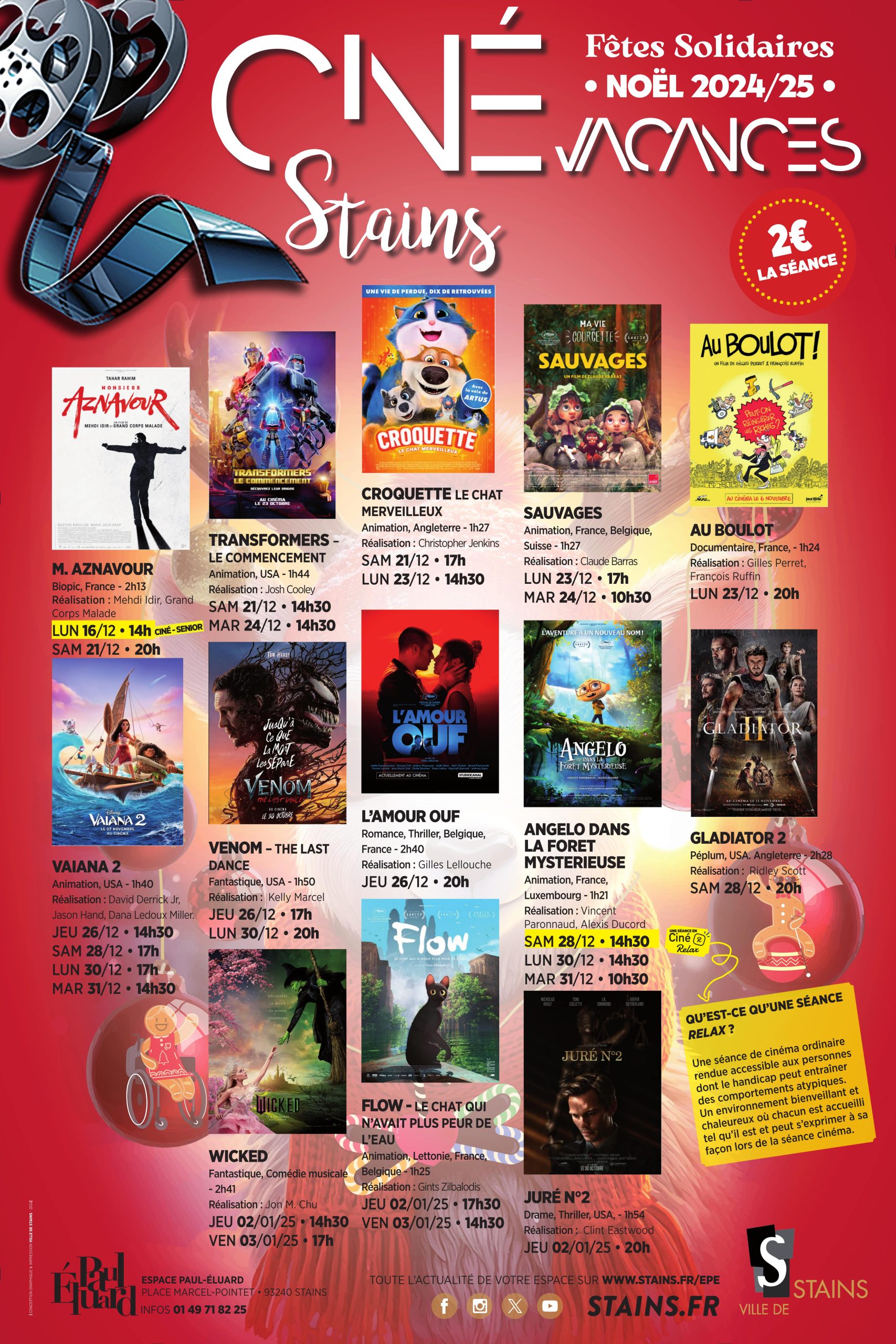 L’Espace Paul Éluard fermera ses portes les 24 et 31 décembre à 12h30. Par conséquent, les séances prévues pour ces deux jours à 14h30 sont annulées.