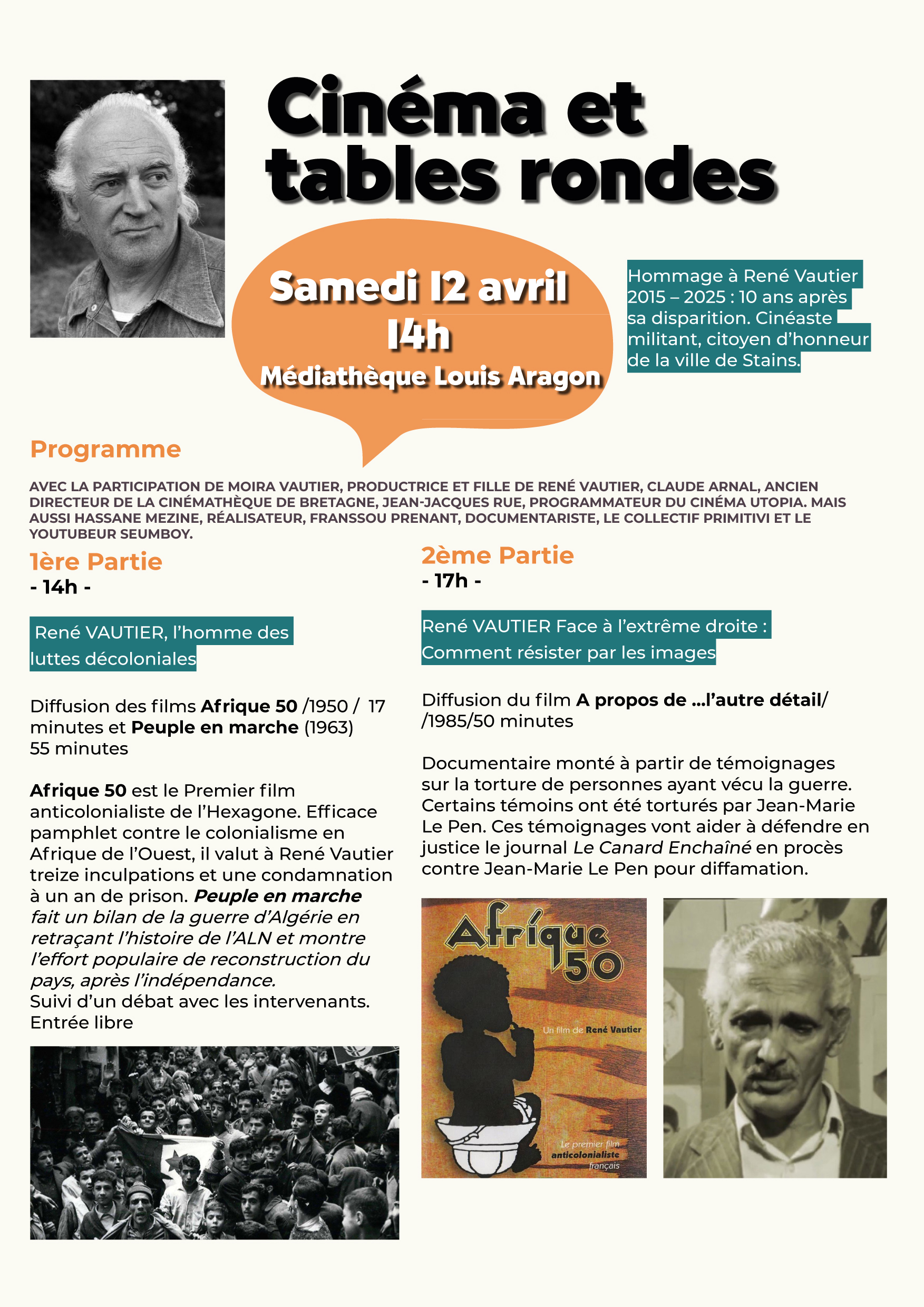 - Cinéma et Tables Rondes le samedi 12 avril à 14h et 17h à la Médiathèque Louis Aragon avec la participation de Moira Vautier, productrice et fille de René Vautier, Claude Arnal, ancien directeur de la cinémathèque de Bretagne, Jean-Jacques Rue, programmateur du cinéma Utopia. Mais aussi Hassane Mezine, réalisateur, Franssou Prenant, documentariste, le collectif Primitivi et le youtubeur Seumboy.