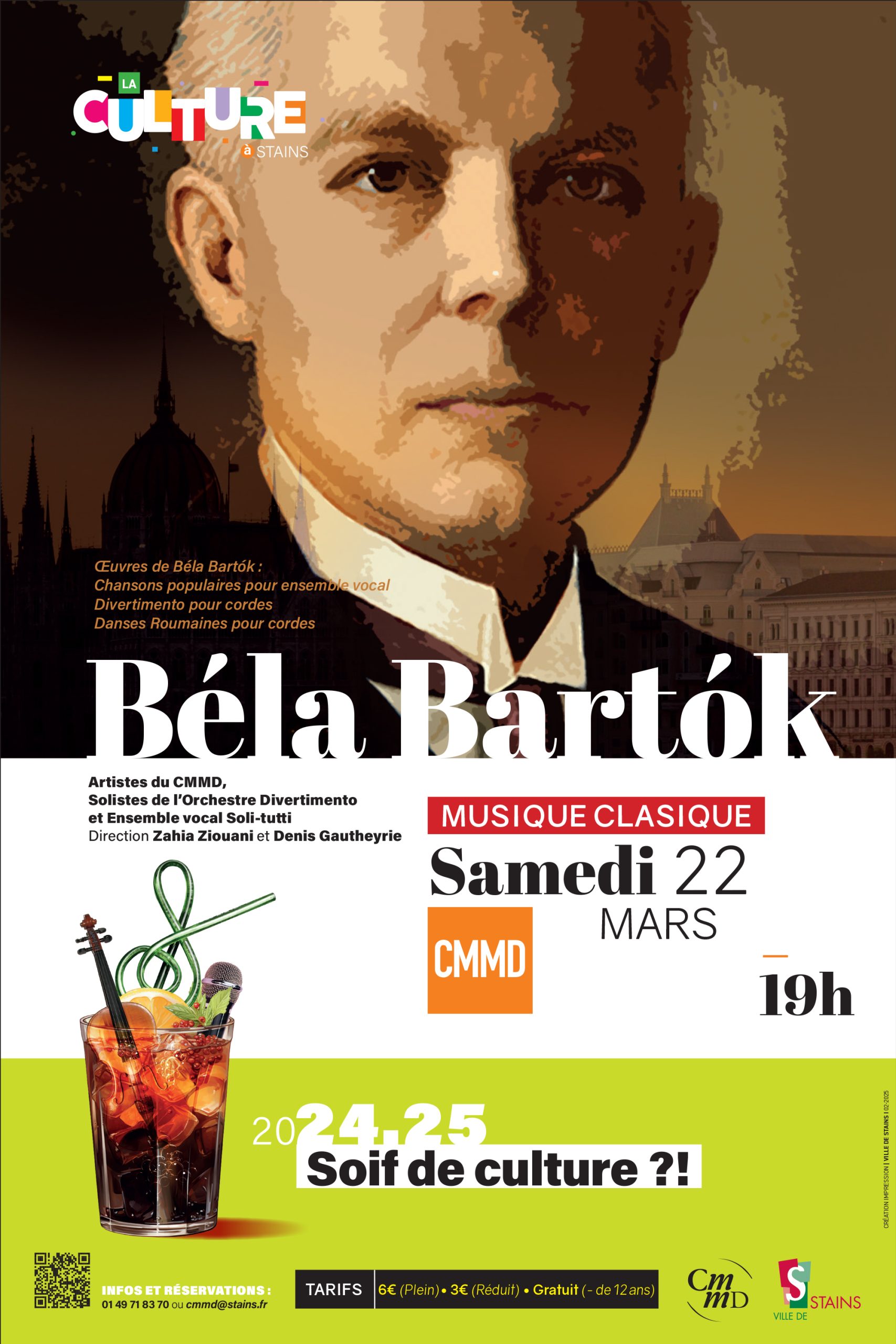 Samedi 22 mars à 19h, les solistes de l’Orchestre Divertimento, l’Ensemble vocal Soli-Tutti et les artistes du CMMD sous la direction de Zahia Ziouani et de Denis Gautheyrie interprèteront des œuvres de Béla Bartók à l’auditorium Xenakis.