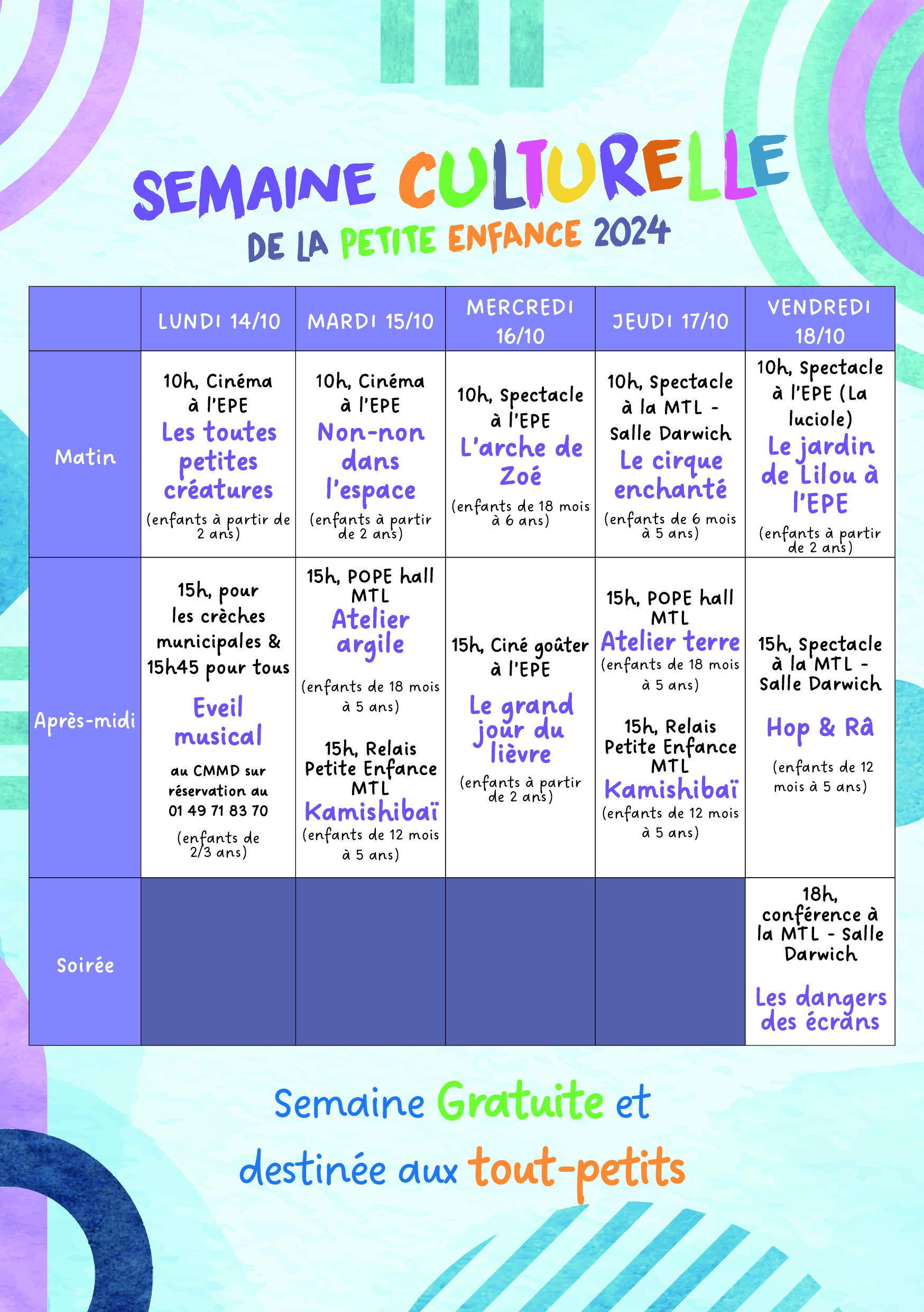 Au cours de cette semaine, la petite enfance sera donc présente aux quatre coins de la ville. Que ce soit à la Maison du temps libre Olivier-Abderide (MTL), à l’Espace Paul-Éluard (EPE), ou encore au Relais petite enfance, les tout-petits seront mis à l’honneur !