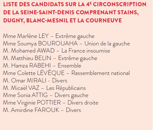 L’Assemblée nationale a été dissoute par le président de la République suite aux résultats des élections européennes. Ainsi, les Français – et donc les Stanois – sont rappelés aux urnes pour élire leur député(e). Stains fait partie de la 4e circonscription de la Seine Saint-Denis qui comprend également les villes de Dugny, La Courneuve et Le Blanc-Mesnil. La députée sortante, élue sous la bannière Nupes en 2022, est Soumya Bourouaha. Elle se représente pour le Nouveau Front populaire. Onze autres candidats sont en lice (voir liste ci-contre).