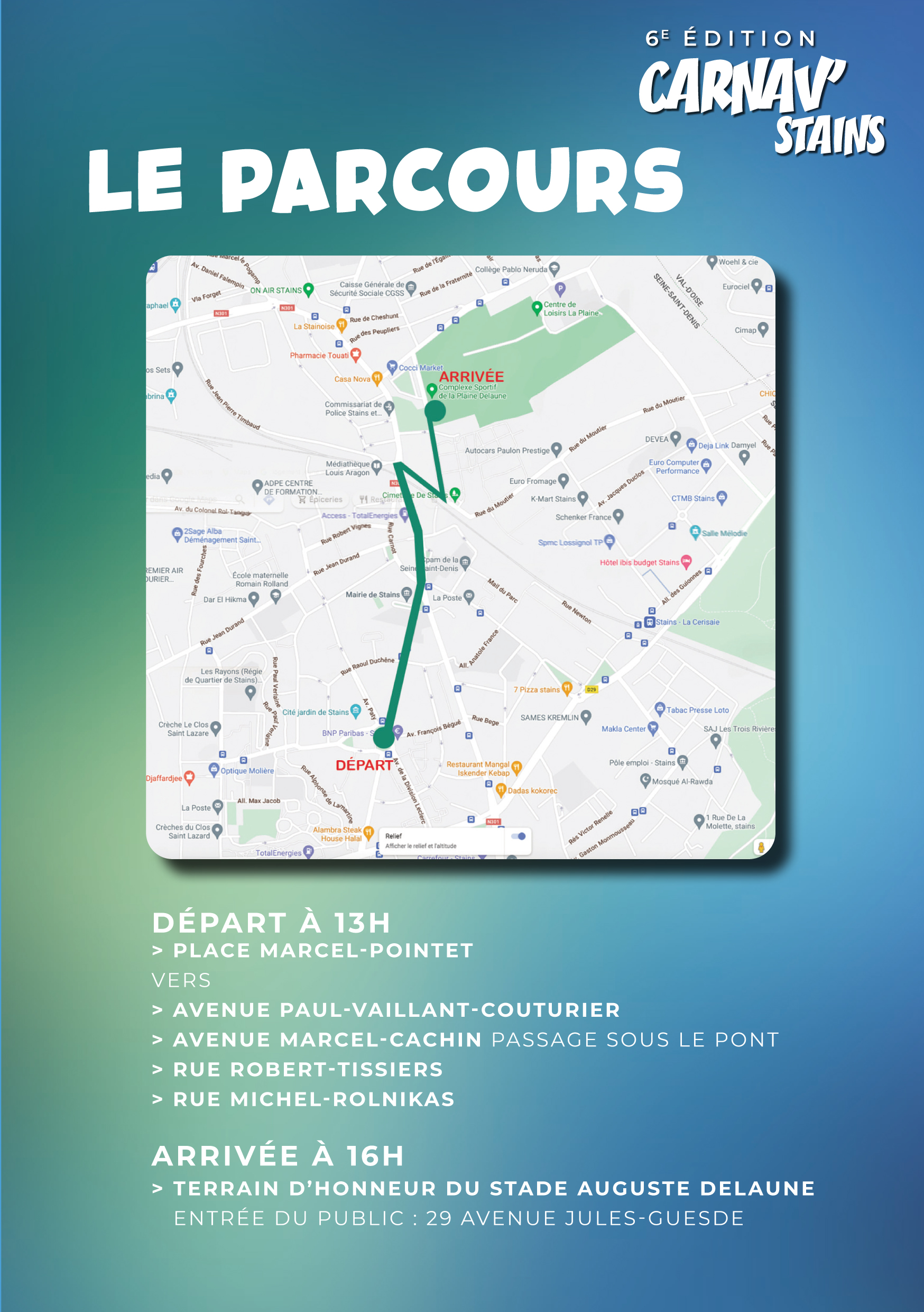 Le départ de la parade sera donné Place Marcel-Pointet à 13h et les groupes défileront vers l’avenue Paul-Vaillant-Couturier, puis vers l’avenue Marcel-Cachin, passeront sous le pont, rue Robert-Tissier, rue Michel-Rolnikas et enfin arriveront à 16h sur le terrain d’honneur du stade Auguste-Delaune. L’entrée du public se fera au niveau du 29, avenue Jules-Guesde. À noter que l’enseigne Carrefour mettra à disposition son parking de 9h à 21h et a offert des denrées alimentaires pour contribuer à la restauration des groupes et des bénévoles.