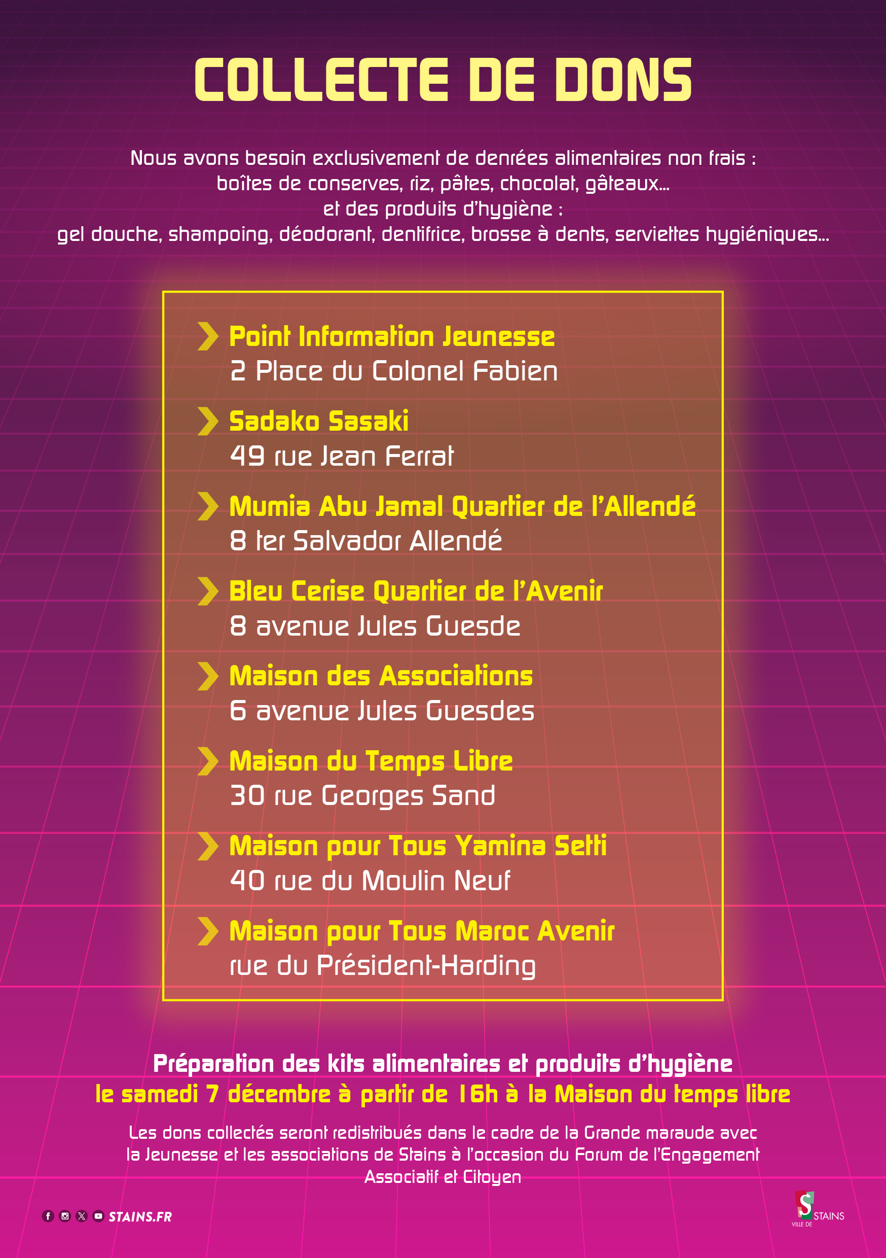 Le forum de samedi sera l’occasion de participer concrètement à une première action utile, avec une grande maraude en fin de journée. Vers 19h30/20h, des bénévoles, agents de la ville et toutes les personnes intéressées partiront à la résidente Crous de Stains, Chemin de Saint-Léger, pour une distribution de kits alimentaires et d’hygiène.