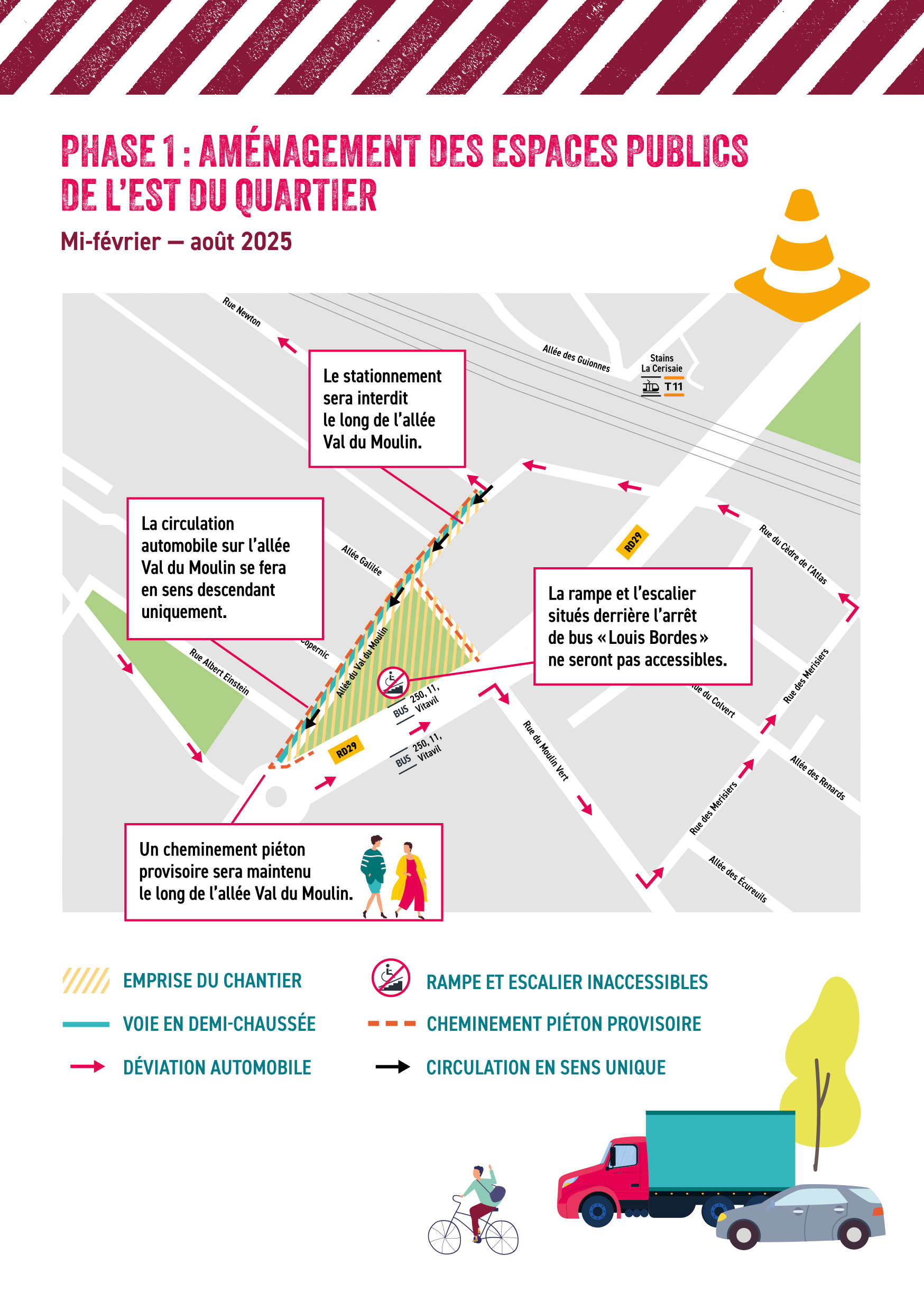 Pendant environ sept mois, plusieurs aménagements vont voir le jour : une piste cyclable bidirectionnelle de 500 mètres, une nouvelle allée piétonne reliant la gare Stains-La Cerisaie à la mairie en 10 minutes, ainsi qu’un éclairage repensé pour plus de sécurité et de confort.