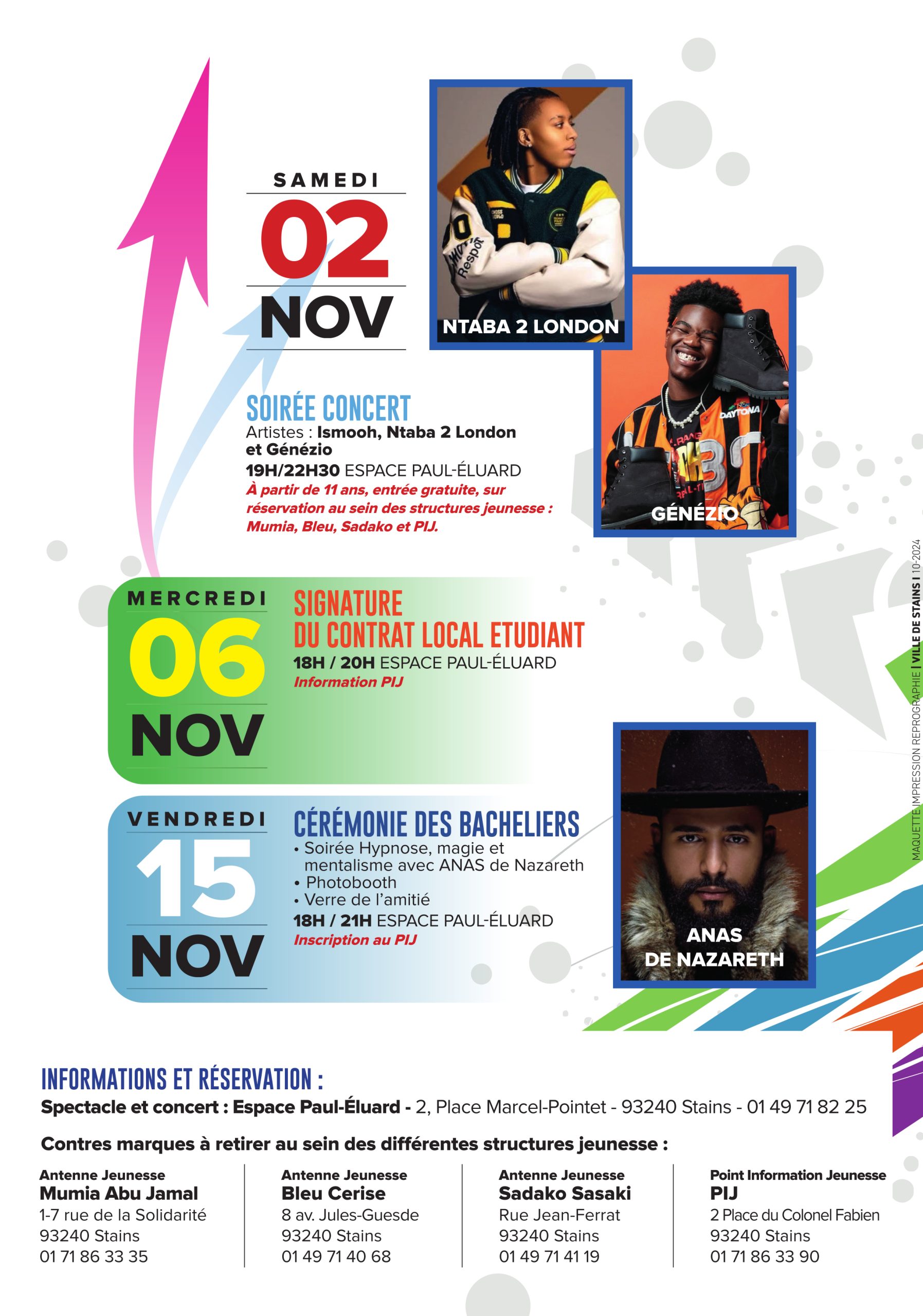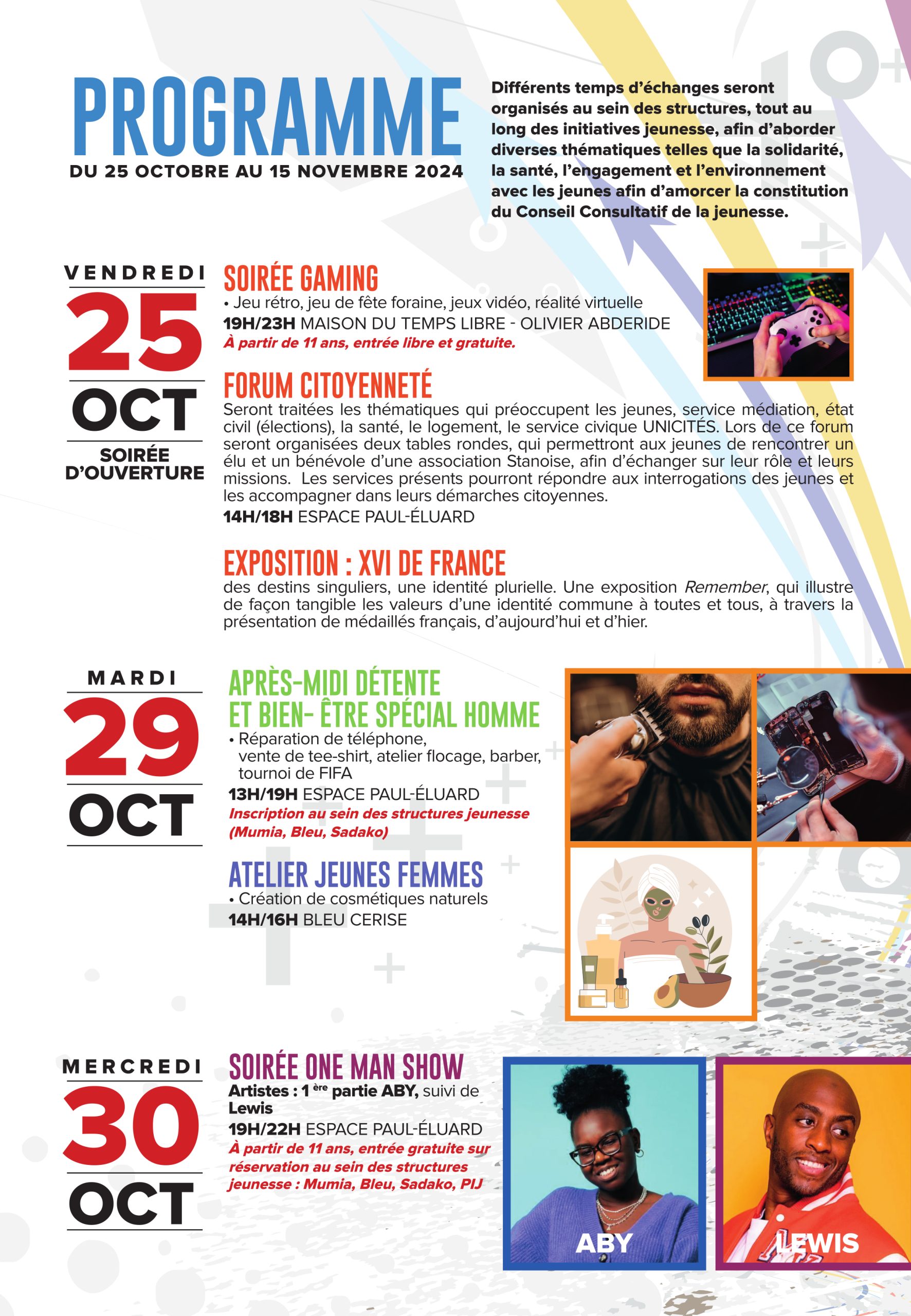 Mercredi 30 octobre, les one man show de Aby suivi de celui de Lewis sont proposés, gratuitement sur inscription auprès des structures jeunesse, aux Stanois de plus de 11 ans à l’Espace Paul-Éluard. Des concerts de pop urbaine d’Ismooh, Ntaba2London et Génézio se dérouleront samedi 2 novembre à 19 heures selon les mêmes modalités que la soirée du 30.