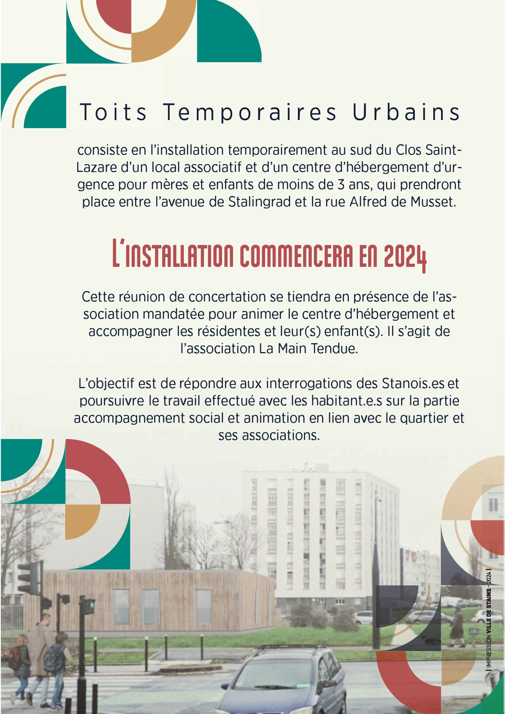 Les Stanois sont invités à participer à un atelier de concertation autour d’un projet que Stains actu avait déjà évoqué ( édition 1118 ) : implanter un local associatif et un centre d’hébergement d’urgence pour 30 mères et 60 enfants de moins de 3 ans entre l’avenue Stalingrad et la rue Alfred-de Musset, le temps que démarrent les aménagements définitifs prévus par le Nouveau programme de rénovation urbaine du Sud (NPRU) du Clos Saint-Lazare.