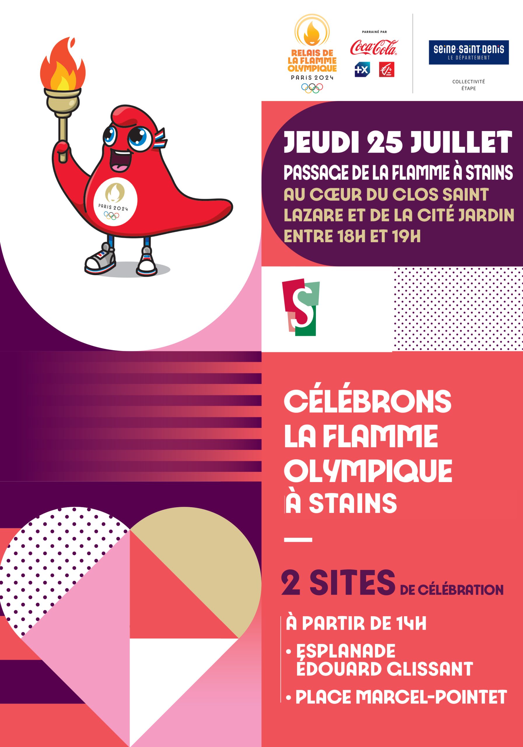 Jeudi 25 juillet, tout au long du passage de la flamme, deux sites de célébrations seront ouverts au public, de 14h à 19 h 30. De nombreuses activités ludiques et sportives permettront aux Stanois de patienter pour admirer le passage du symbole olympique. Le premier se situera au Clos Saint-Lazare au niveau du square Édouard-Glissant et le second, place Marcel-Pointet.