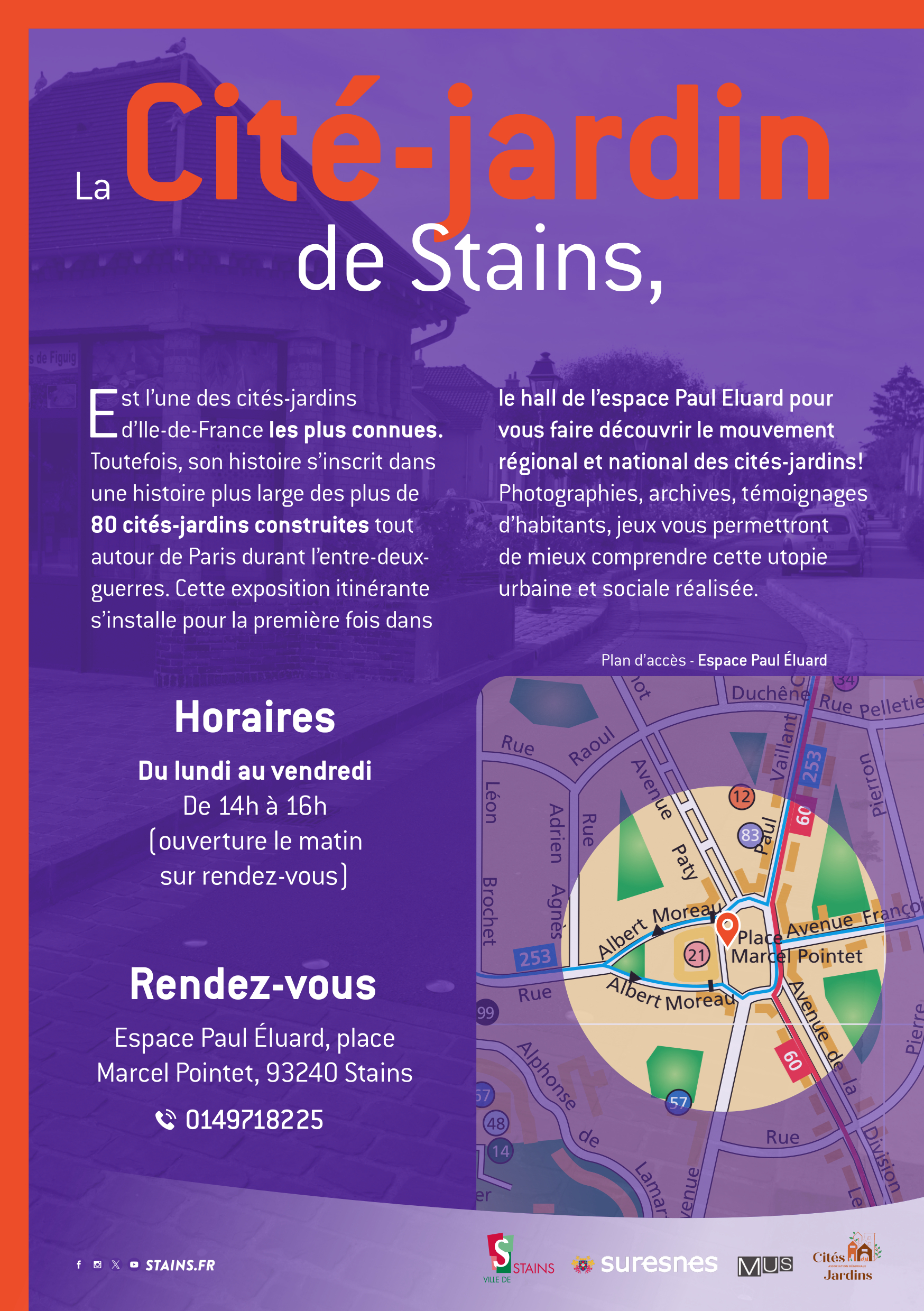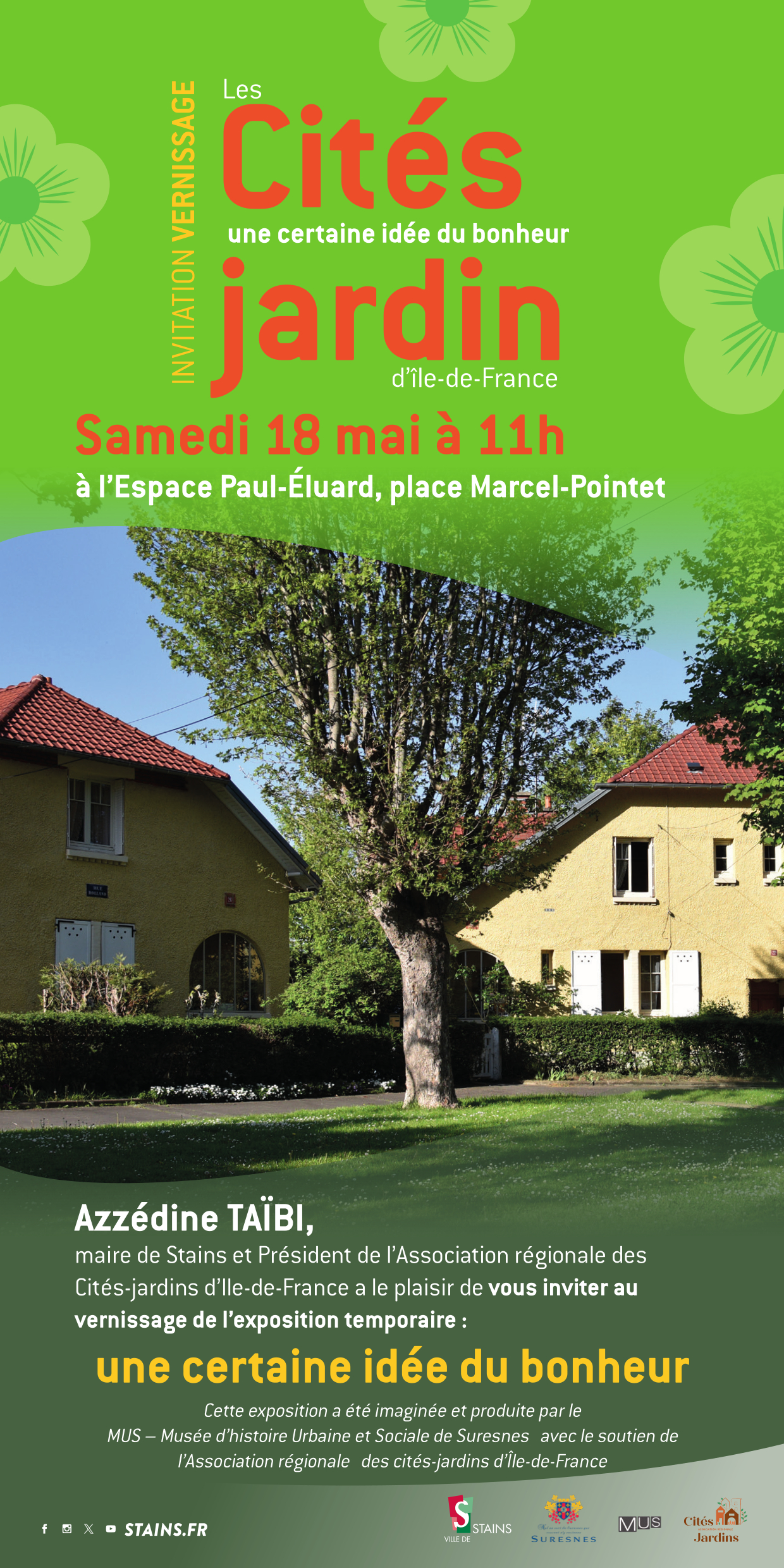 Si vous souhaitez en apprendre plus sur ce site que l’on peut qualifier d’historique, notez dans vos agendas que du vendredi 17 mai au dimanche 16 juin, à l’Espace Paul Éluard, une exposition itinérante s’installe pour la première fois dans le hall pour vous faire découvrir le mouvement régional et national des Cités-jardins : photographies, archives, témoignages d’habitants, jeux vous permettront de mieux comprendre cette utopie urbaine et sociale. Le samedi 18 mai à 11h, le vernissage de l’exposition temporaire aura lieu.