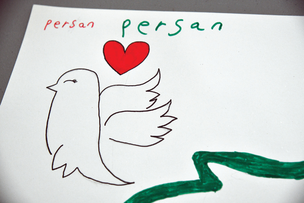 Autour des tables, des femmes sont assises, le visage penché sur leur travail : certaines ajoutant des éléments de leur imaginaire, d’autres écrivant des mots choisis avec soin, en français et dans leur langue maternelle. Parfois, des feutres ouverts roulent doucement entre les coudes, les doigts sont foncés de couleurs. L’atmosphère est concentrée, appliquée.