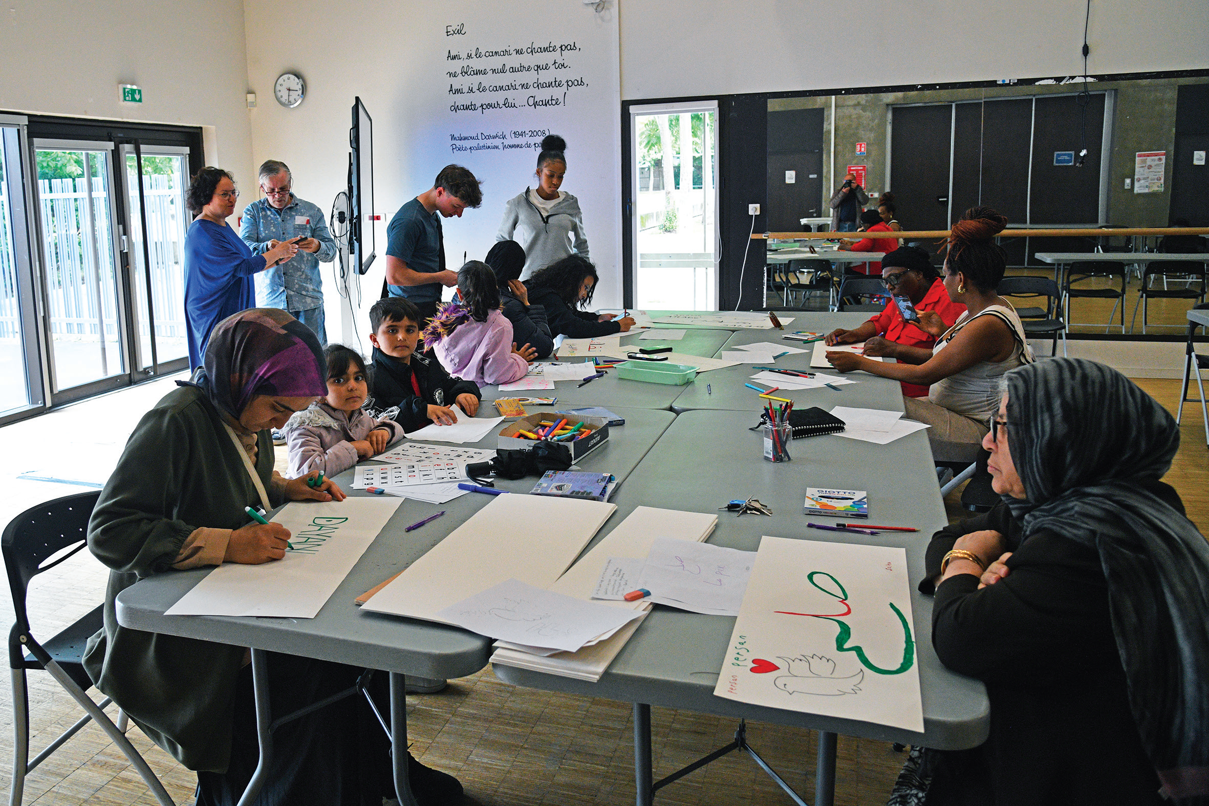 Les tables dans la salle des activités de la Maison du temps libre Olivier-Abdéride sont encombrées de papiers colorés, de feutres ouverts, de pots de colle entamés. Il est quinze heures ce mercredi 4 juin, la salle d’activités commence à s’animer. Les grandes baies vitrées font passer la lumière, adoucie par des rideaux clairs. On entend des rires discrets, le frottement de feutres sur le carton, des hésitations en français. « Ça s’écrit avec un ou deux r ? », s’interroge une voix. Une autre, un peu plus sûre, souffle la réponse.