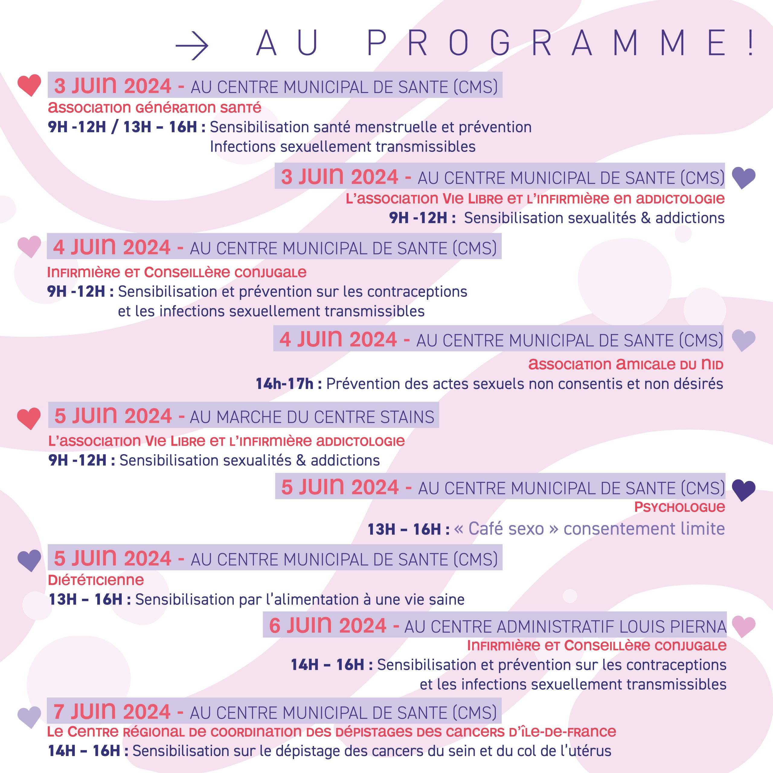 Dès le 3 juin au Centre municipal de sante (CMS) l’association Génération santé de 9h à 12h puis de 13h à 16h propose une sensibilisation « santé menstruelle et prévention infections sexuellement transmissibles ». Mais aussi l’association Vie libre et l’infirmière en addictologie pour évoquer des questions autour de la sexualité et des addictions (9h à 12h).
