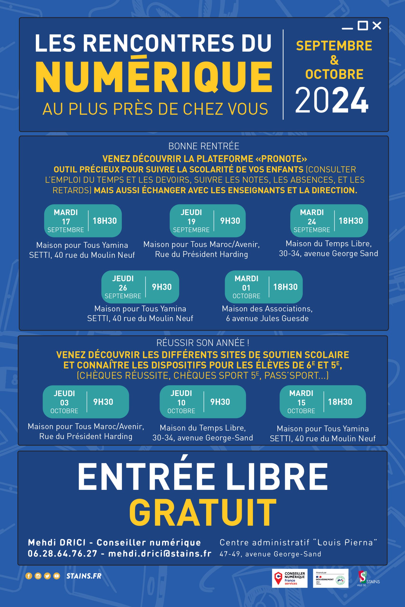 Dans l’optique d’aider les parents à mieux suivre la scolarité de leur enfant, la ville de Stains lance des ateliers numériques. Gratuits, en groupe et personnalisés, ces Rencontres numériques ont pour but d’aider à prendre en main par exemple l’application Pronote. En tant qu’outil pédagogique, Pronote permet d’avoir un suivi sur la scolarité des élèves. Bien que son utilité soit précieuse, notes, devoirs, communication avec les professeurs, etc. son fonctionnement est parfois compliqué.