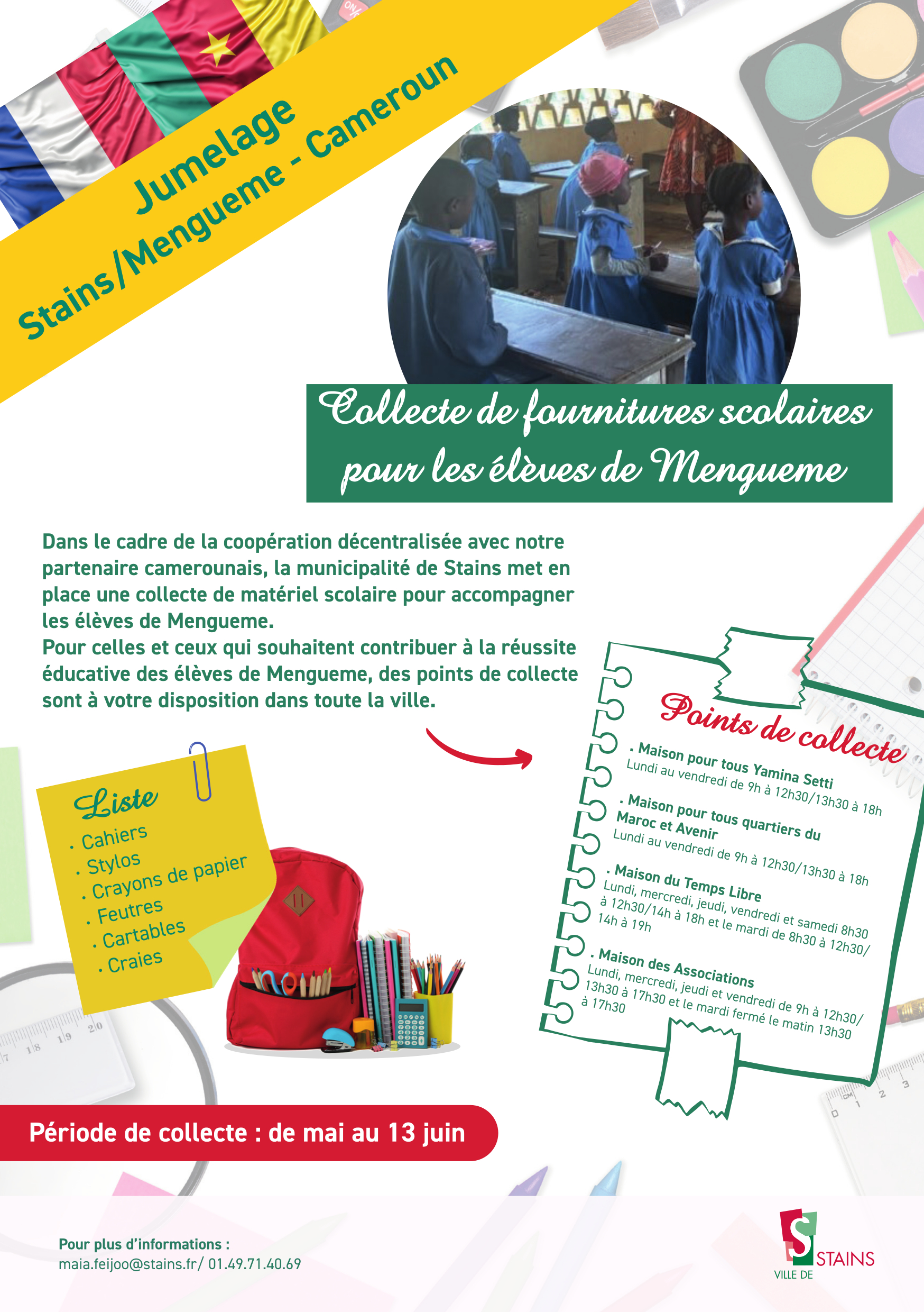 Dans le cadre du jumelage entre la ville de Stains et la commune de Mengueme au Cameroun, la municipalité lance une collecte de matériel scolaire pour soutenir les élèves de Mengueme et favoriser leur réussite éducative.