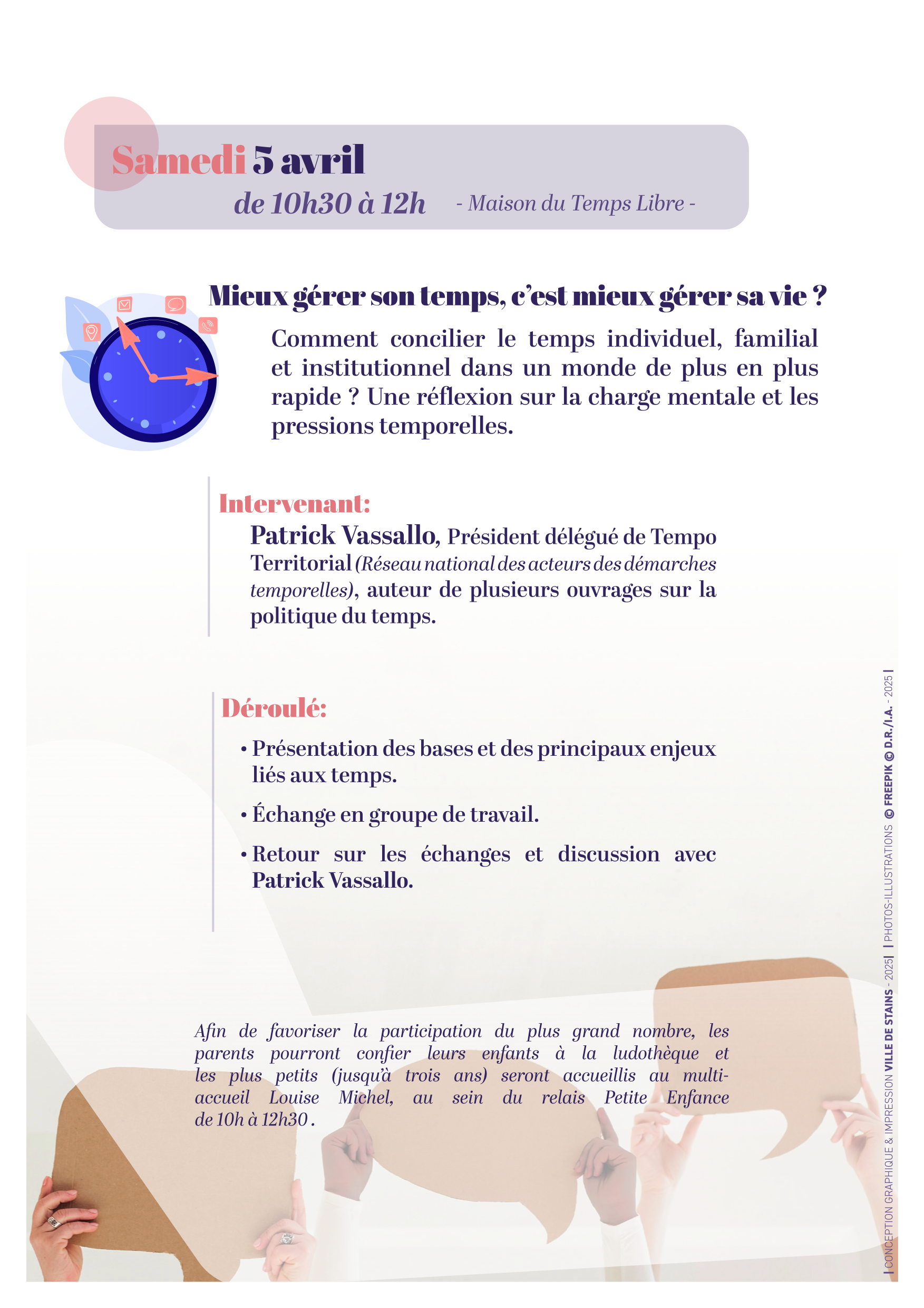 Les échanges s’articuleront autour de « Comment concilier le temps individuel, familial et institutionnel dans un monde de plus en plus rapide ? Une réflexion sur la charge mentale et les pressions temporelles ».