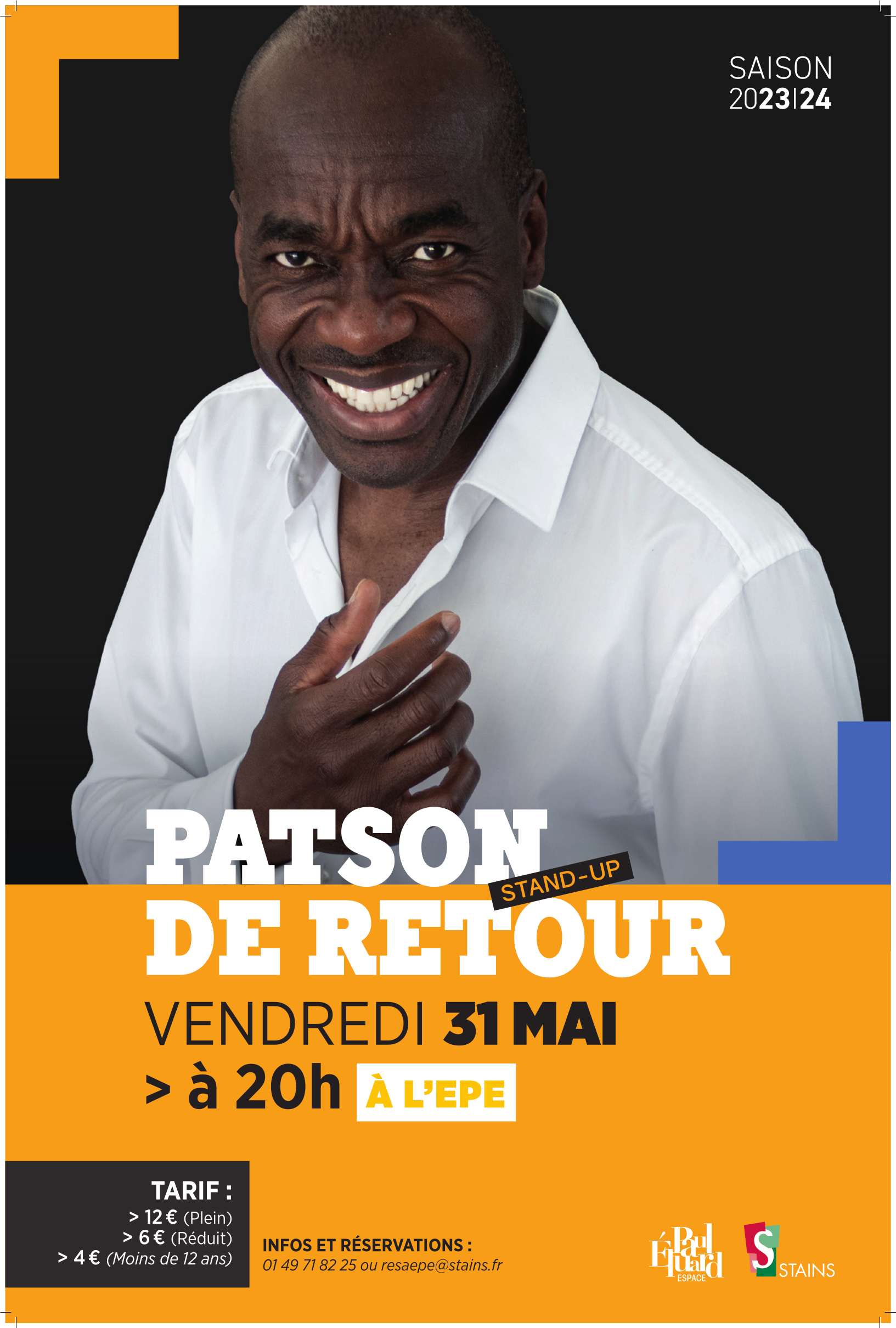 Depuis plusieurs semaines, il signe un retour en force avec un nouveau spectacle, Patson de retour. « Attachant et plein d’humanité, il se donne sans retenue à son public dans un vrai stand-up à l’américaine », témoignent ceux qui ont déjà eu l’opportunité de voir le show. En effet, à en croire les critiques, il n’a rien perdu de sa verve et tire à « vannes réelles » sur tout le monde. Ceux qui seront au premier rang à l’Epe n’ont qu’à bien se tenir. Un joli spectacle accessible à tous pour passer un agréable moment où les fous rires seront garantis.