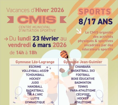 Du lundi 23 février au vendredi 6 mars 2026, le Centre municipal d’initiation sportive (CMIS) propose aux jeunes de 8 à 17 ans de bouger,…
