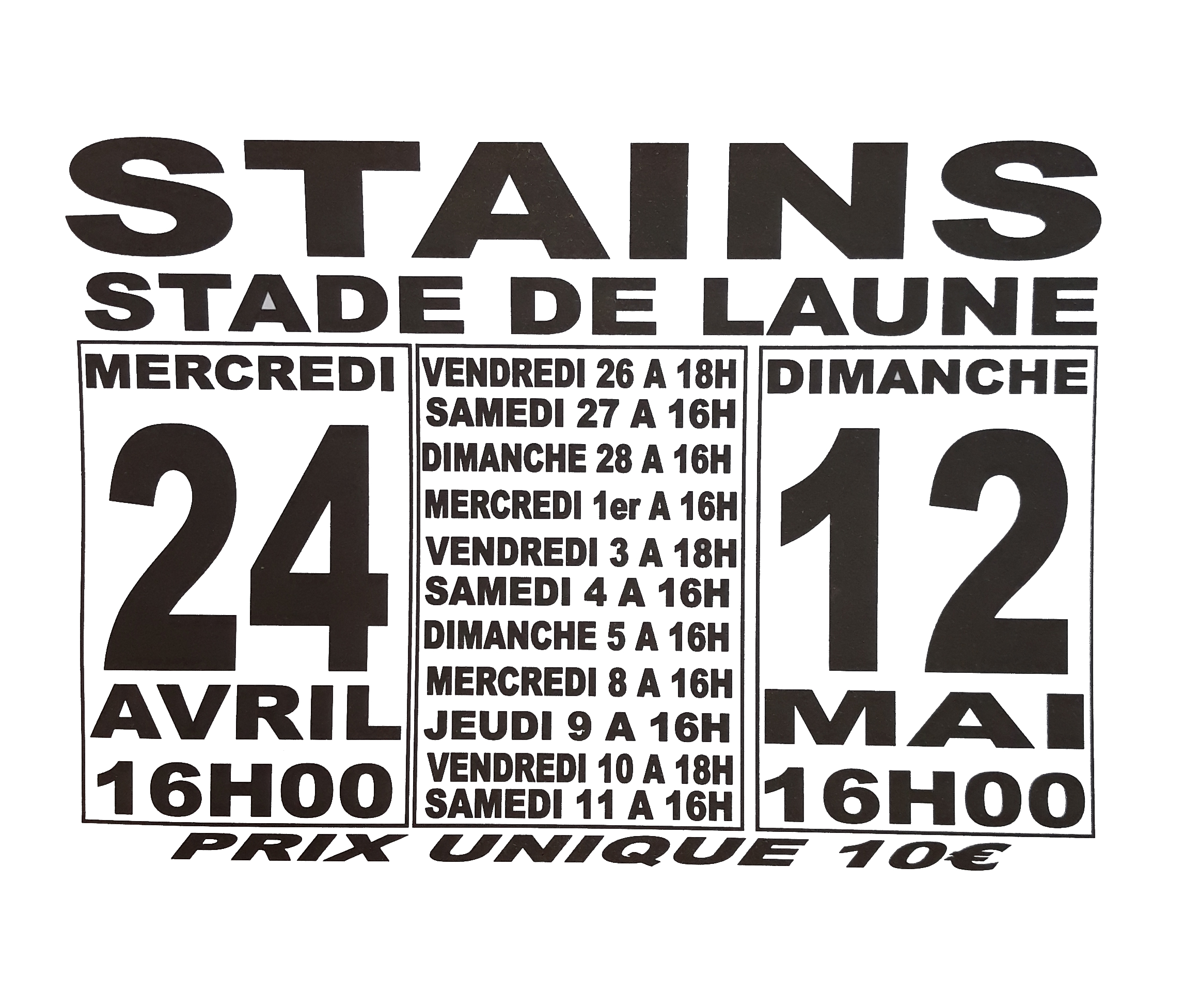 À côté du parking du Stade Delaune du 26 avril au 12 mai (voir date et heure ci-dessous) prix unique de 10€.
