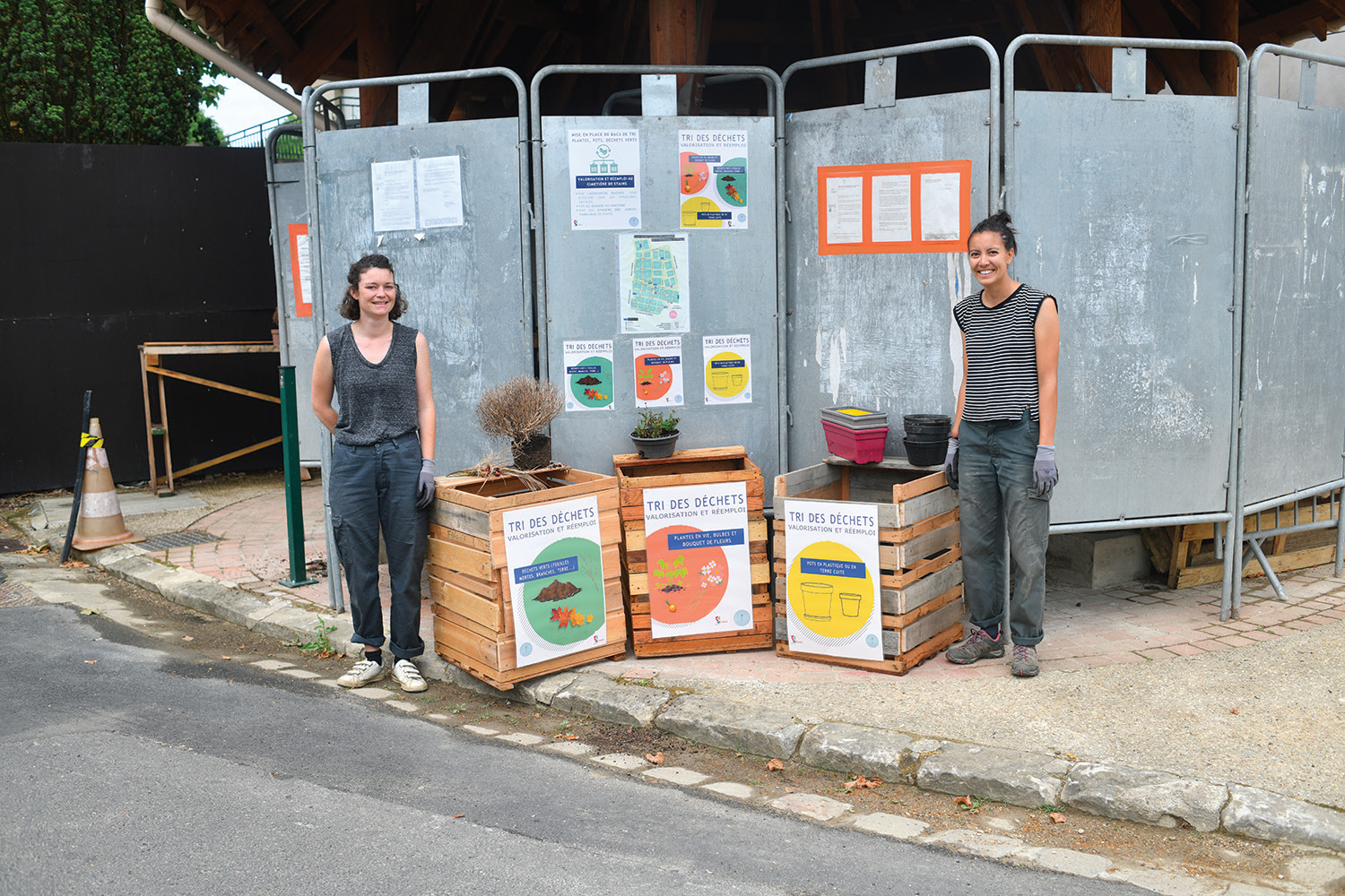 Dans l’idée de réduire cette quantité de déchets, donc leur traitement et leur transport et par conséquent leurs émissions de gaz à effet de serre, nous avons commencé un travail autour de la valorisation des déchets végétaux par le réemploi. Juliette et Morgane de l’association Racines sont en train de construire les bacs de récupération que nous allons installer d’ici quelques jours.»